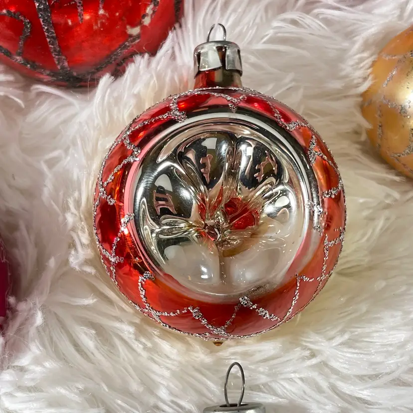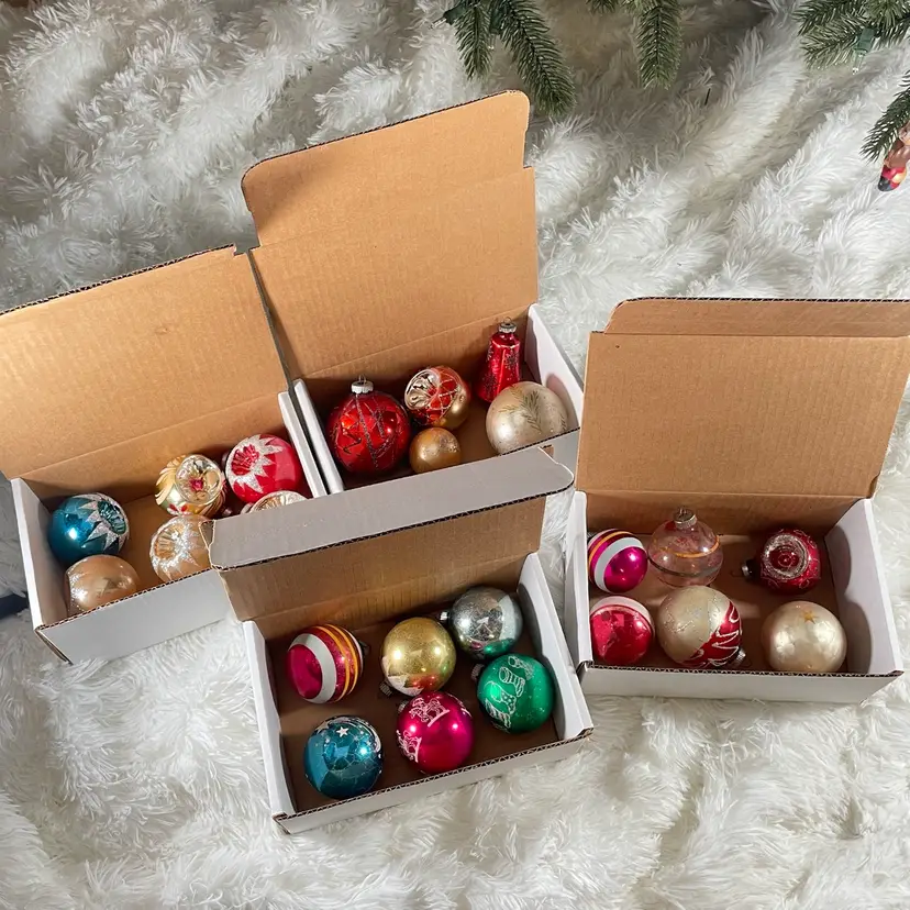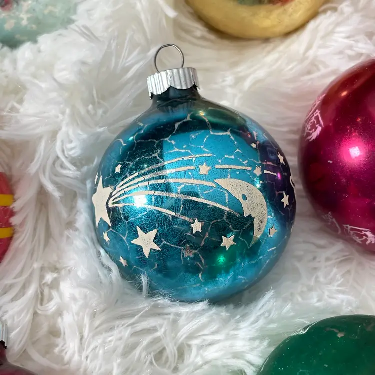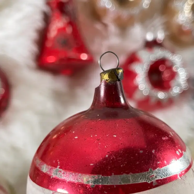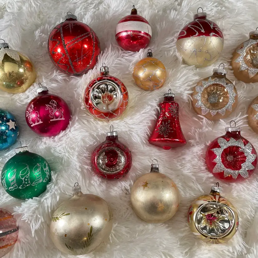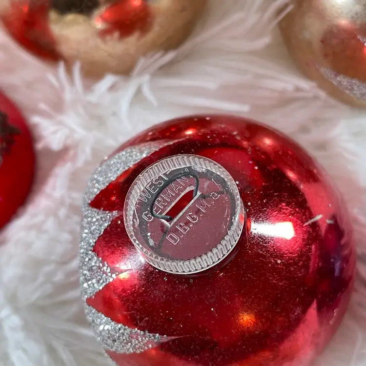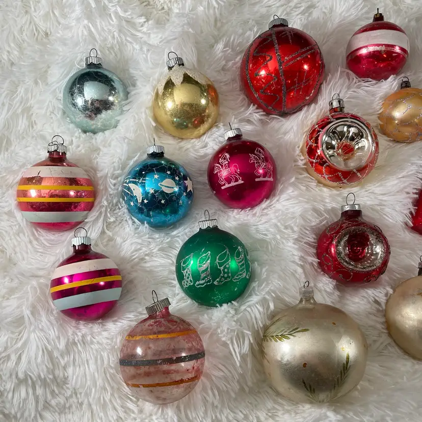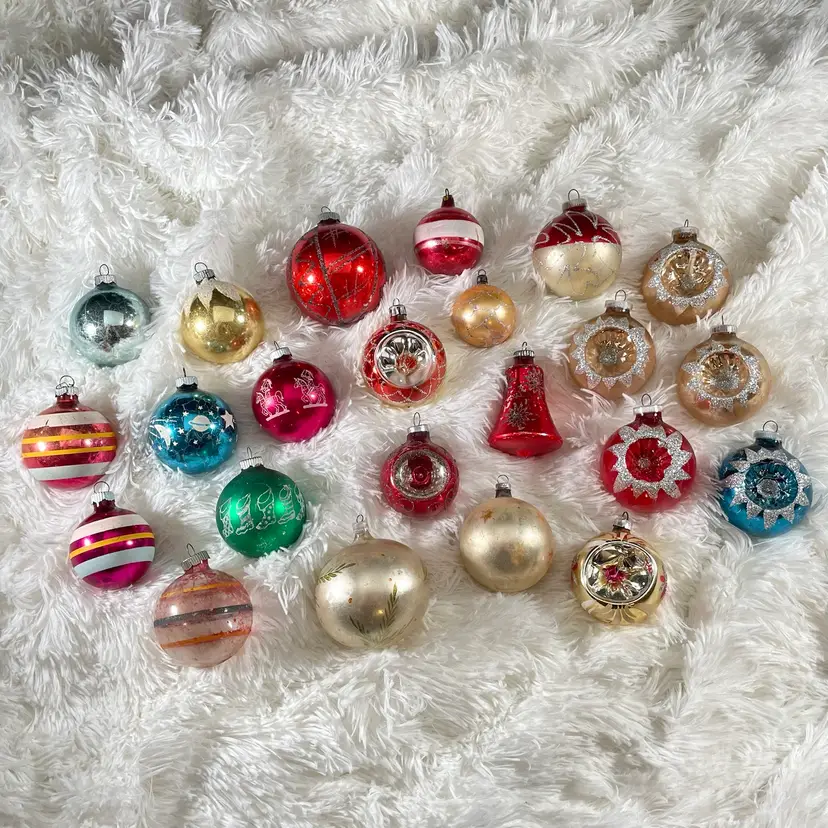 This is a lovely mix of 23 midcentury mercury glass ornaments ready to adorn your tree. The majority are marked Shiny Brite or have Lanissa's plastic West Germany cap, a German company in association with Shiny Brite by way of their shared owner, Max Eckardt. 4 are unmarked, 3 are marked West Germany (but maker company unknown), and 1 is marked Austria.