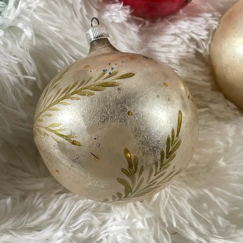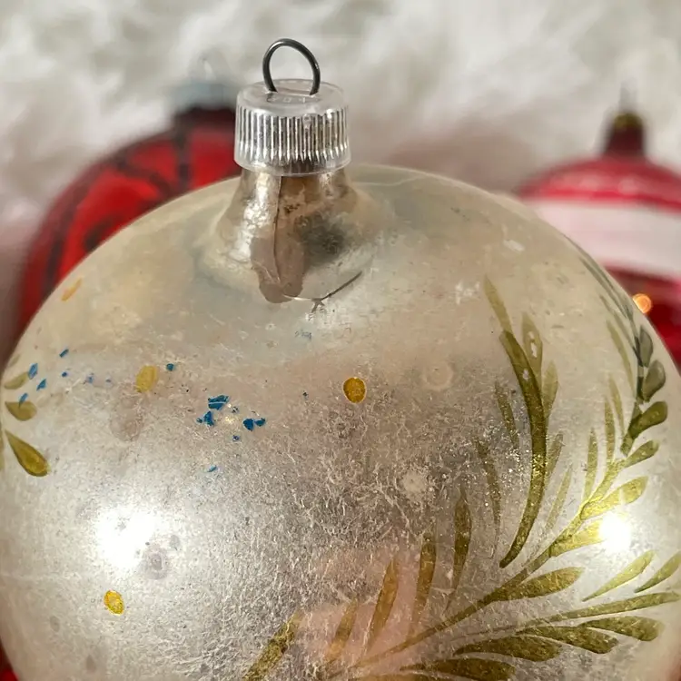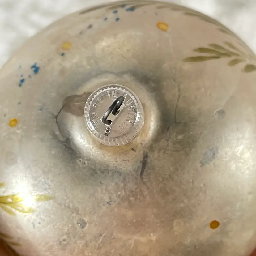 Austria: 1 silvery with fine hand painting (does appear worn away aside from green leafy design - this is the ornament with crack at the top - cap fits loose, but does hold)