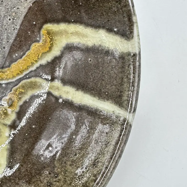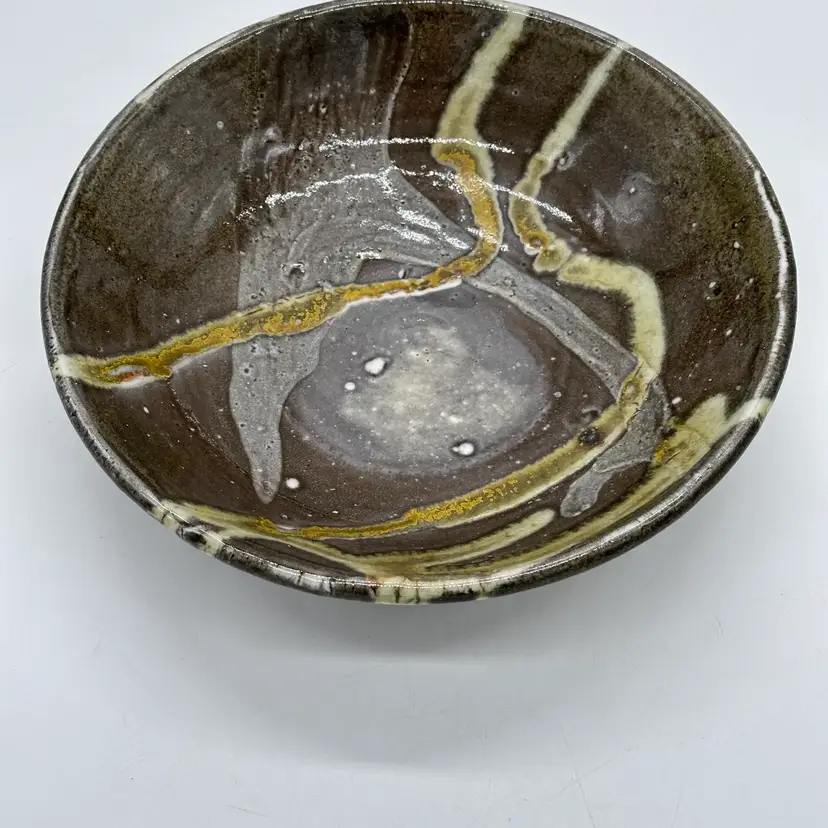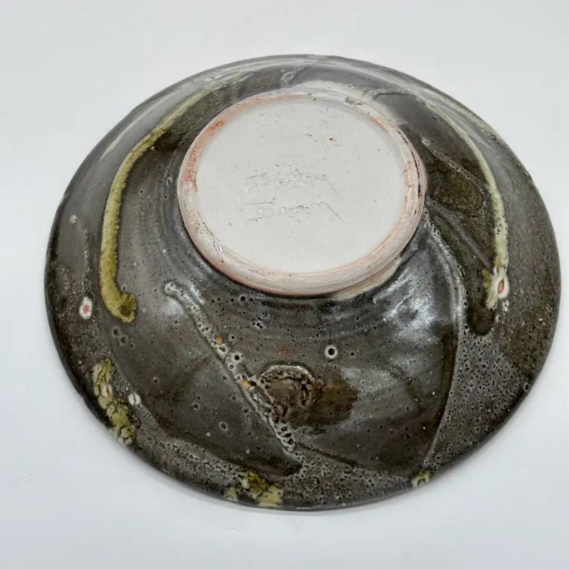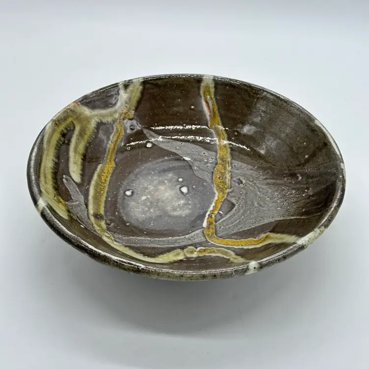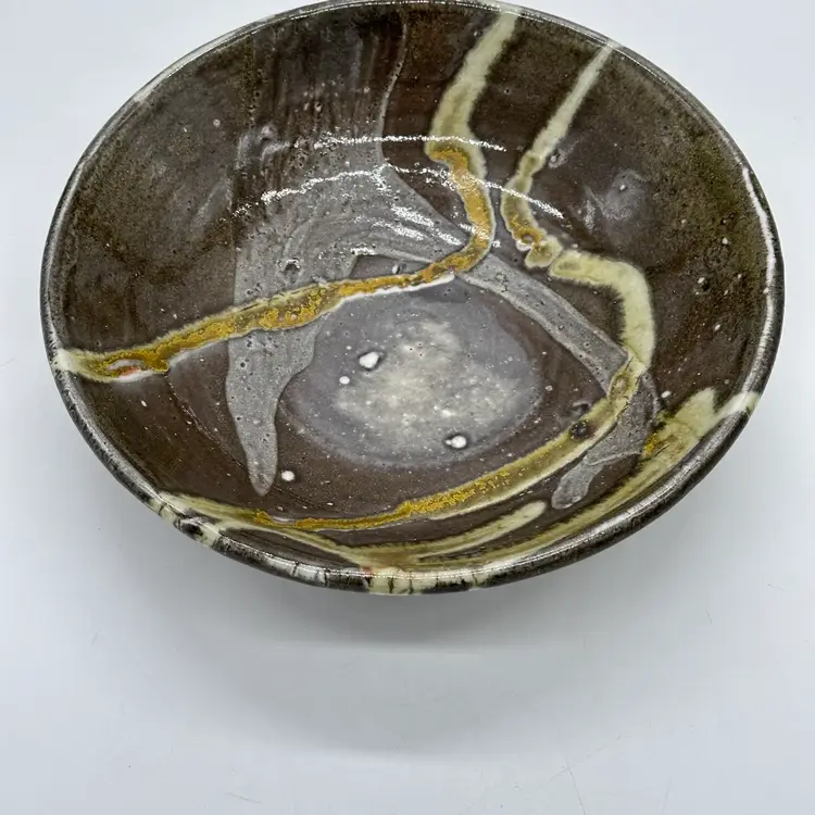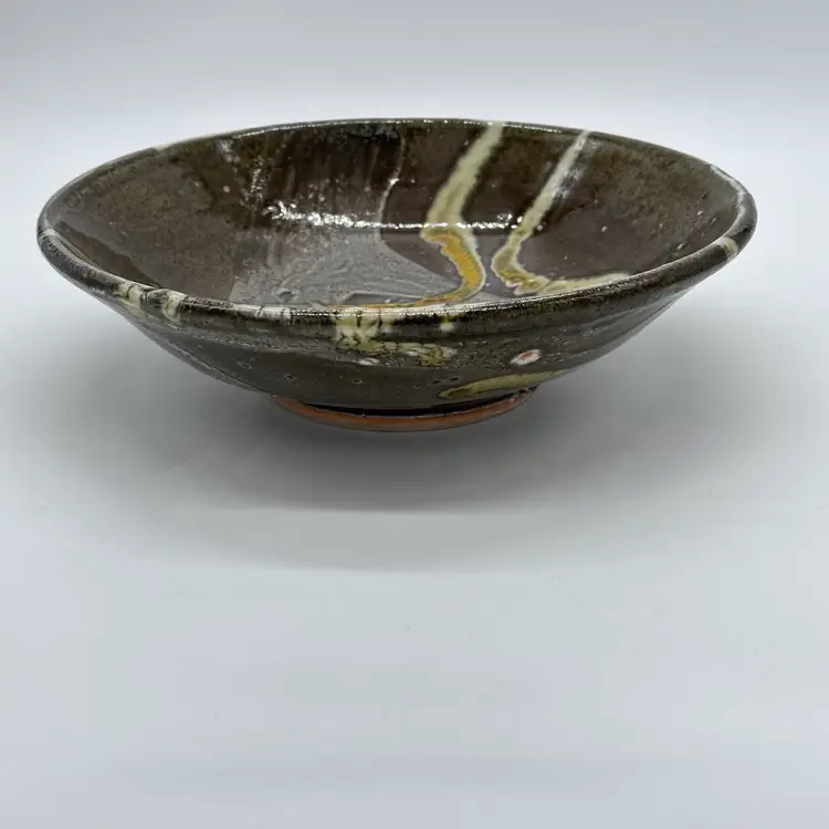 This handmade brown splatter abstract bowl is a unique addition to any home decor. The round shape and 9 3/4 inch diameter make it an ideal for function or as a decorative piece for any decor. The bowl is made of clay and has a height of 2 3/4 inches. Condition is used but in good condition. Does not have any chips or cracks.