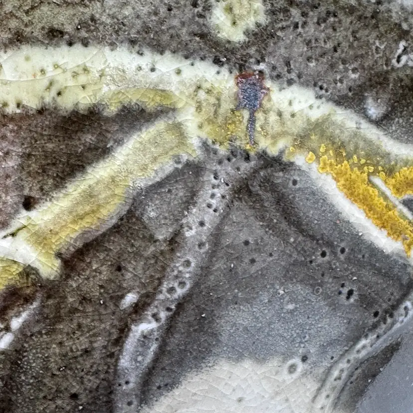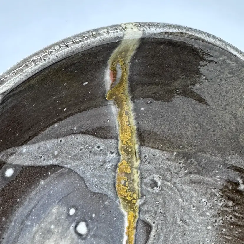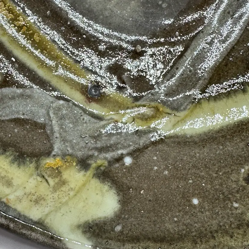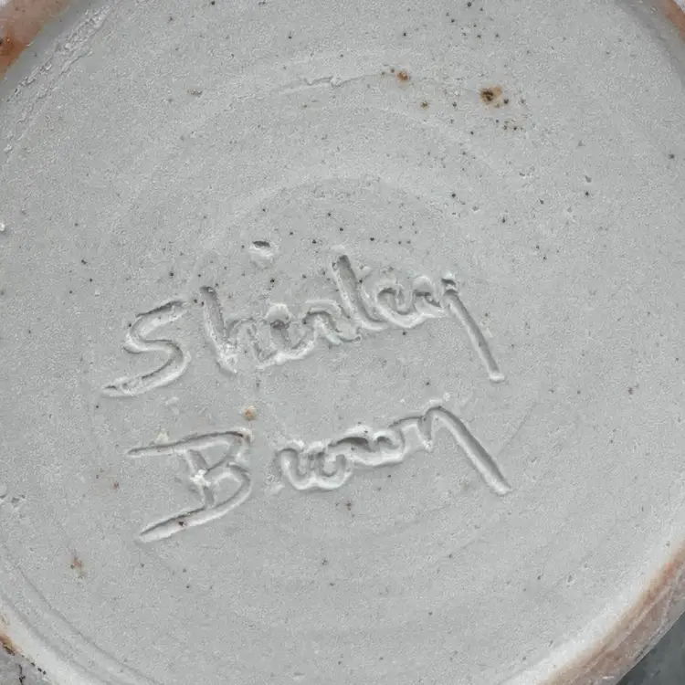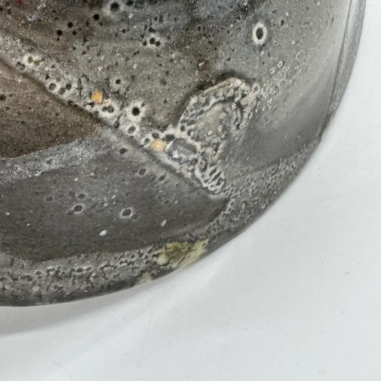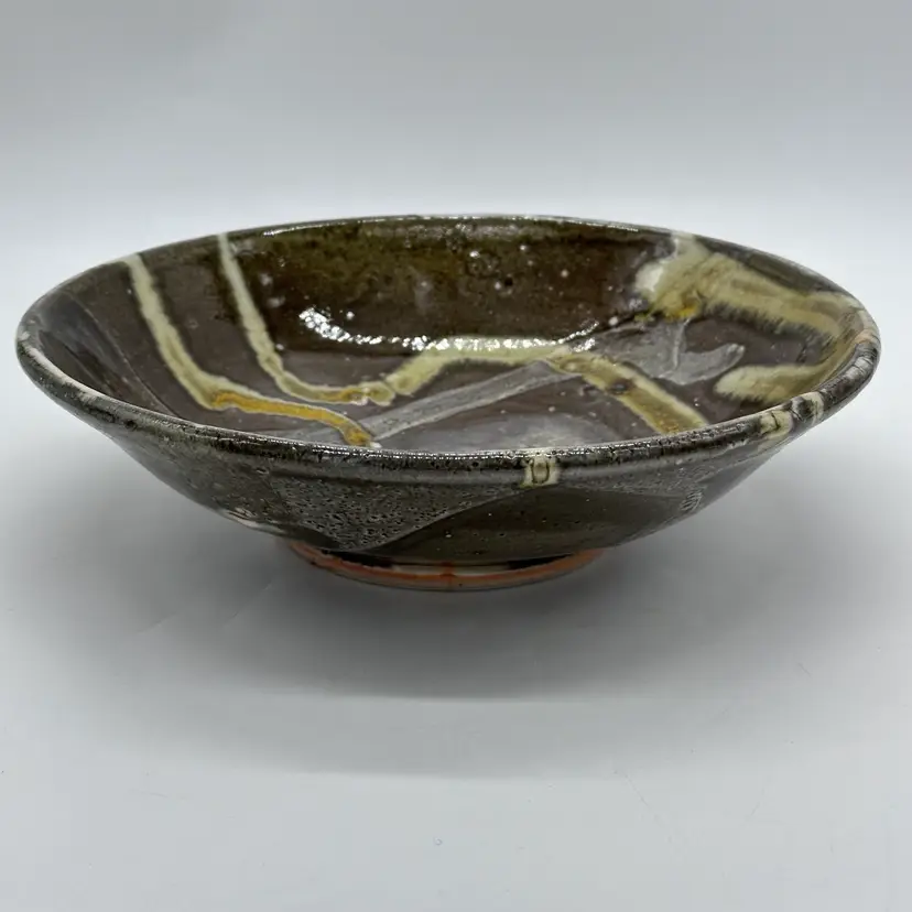 This handmade brown splatter abstract bowl is a unique addition to any home decor. The round shape and 9 3/4 inch diameter make it an ideal for function or as a decorative piece for any decor. The bowl is made of clay and has a height of 2 3/4 inches. Condition is used but in good condition. Does not have any chips or cracks.