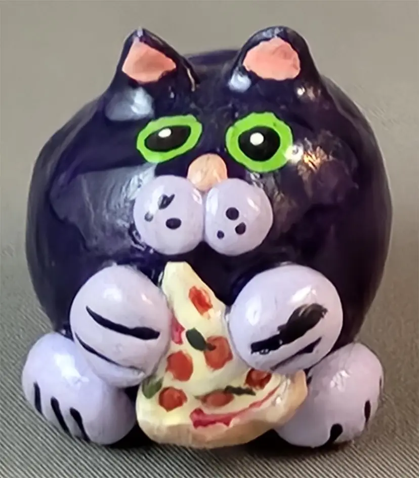 Who doesn't love pizza? Shirley's Cats certainly do! And this dark purple and lavender cat has a big slice of pepperoni and green pepper pizza.
