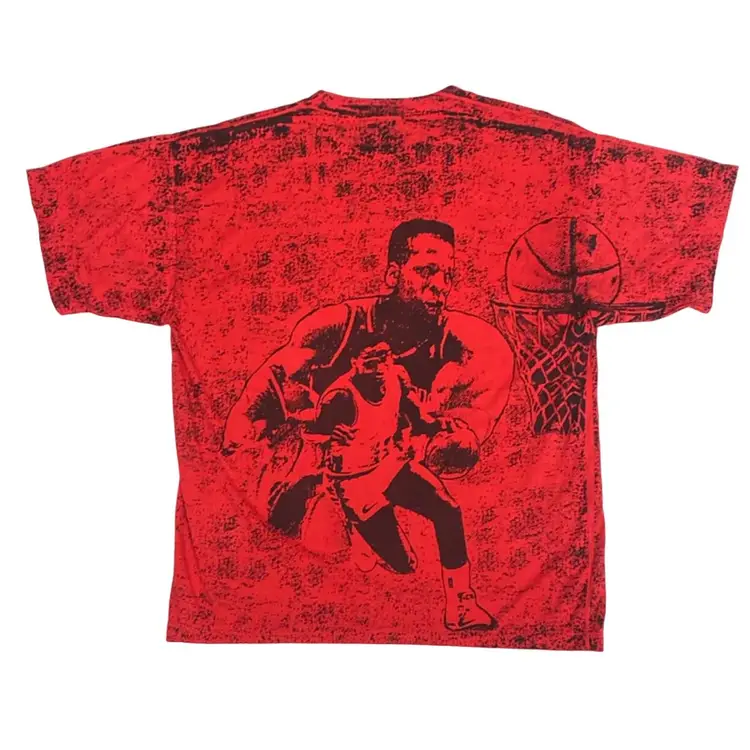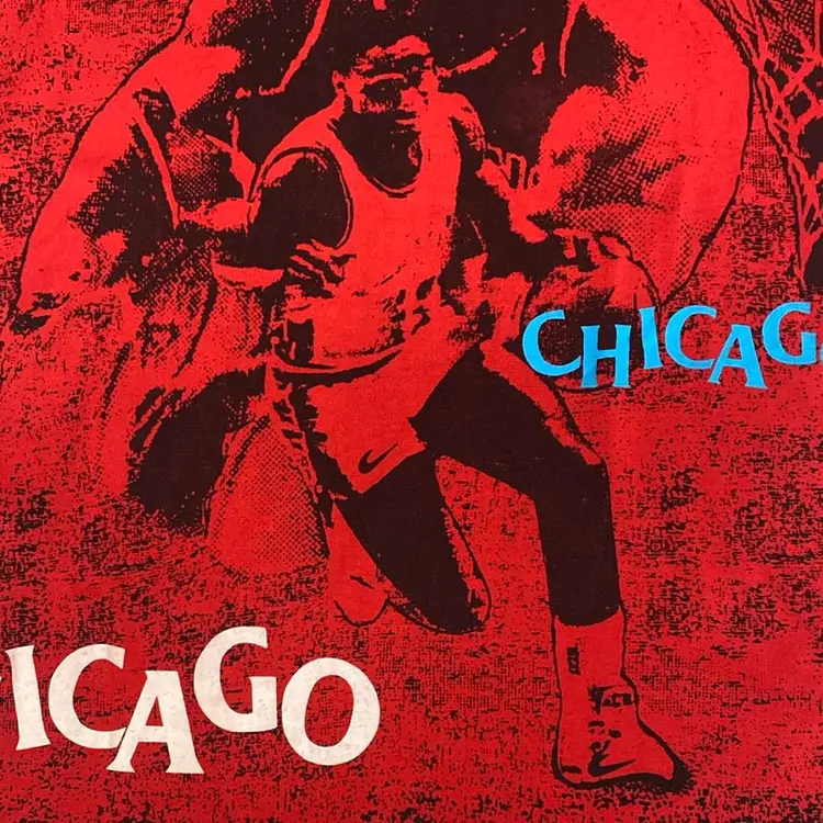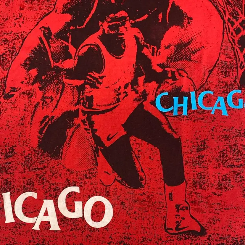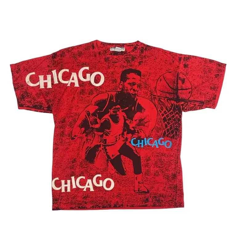 Unique AOP Jordan-era "Chicago" basketball tee, with Black Flag-esque typography! c. 90s, Excellent Condition Made by Citisports, Fits L (22" x 29")