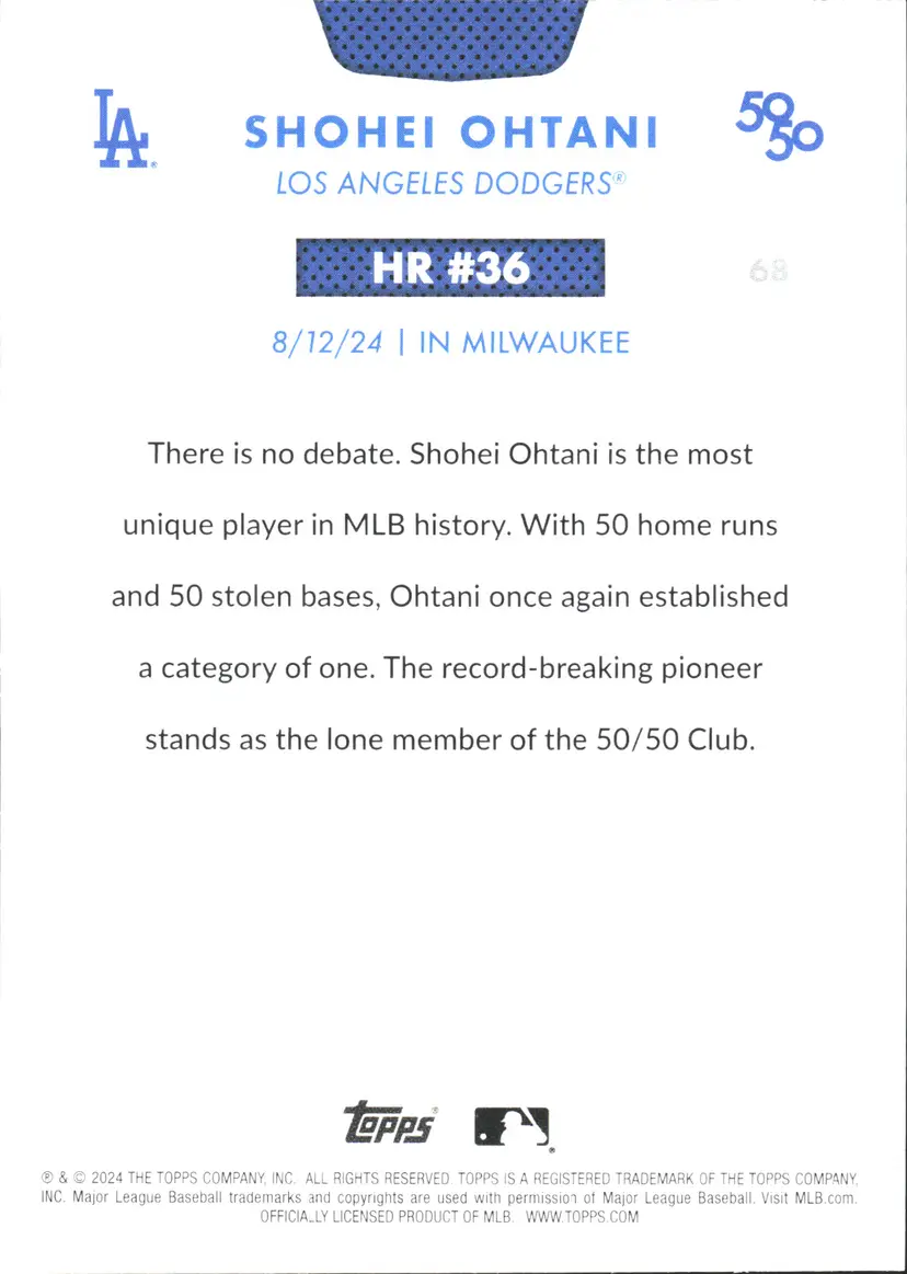 1st time buyer? Get $5 Off with code DISTRICT5 at checkout! Card as shown. All cards $20 and under ship PWE via lettertrackpro [https://www.letter-track.com/registerap.asp?AFID=8757] Type: Sports Trading Card Sport: Baseball League: Major League Baseball (MLB) Autographed: No Set: 2024 Topps 50 Manufacturer: Topps Features: Base Set Player/Athlete: Shohei Ohtani Team: Los Angeles Dodgers Card Number: 68 Season: 2024
