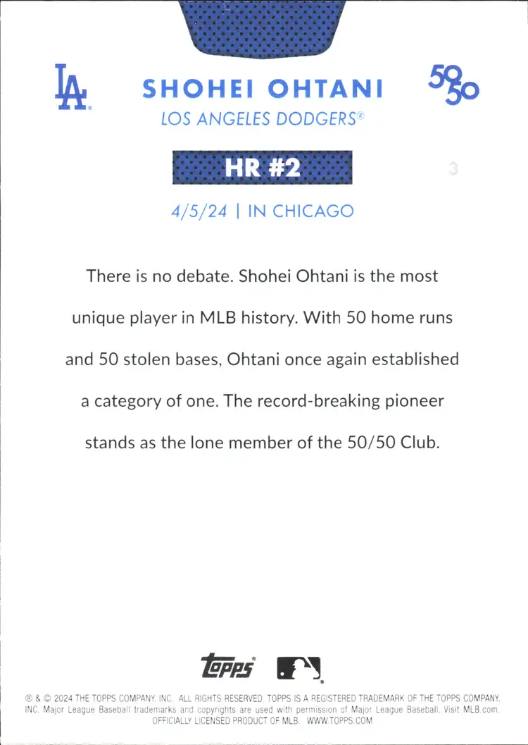 1st time buyer? Get $5 Off with code DISTRICT5 at checkout! Card as shown. All cards $20 and under ship PWE via lettertrackpro [https://www.letter-track.com/registerap.asp?AFID=8757] Type: Sports Trading Card Sport: Baseball League: Major League Baseball (MLB) Autographed: No Set: 2024 Topps 50 Manufacturer: Topps Features: Base Set Player/Athlete: Shohei Ohtani Team: Los Angeles Dodgers Card Number: 3 Season: 2024