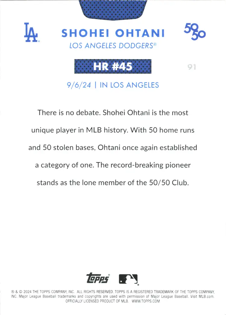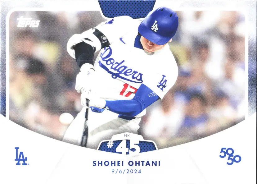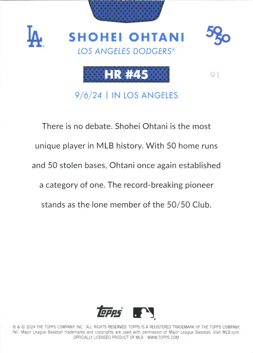 1st time buyer? Get $5 Off with code DISTRICT5 at checkout! Card as shown. All cards $20 and under ship PWE via lettertrackpro [https://www.letter-track.com/registerap.asp?AFID=8757] Type: Sports Trading Card Sport: Baseball League: Major League Baseball (MLB) Autographed: No Set: 2024 Topps 50 Manufacturer: Topps Features: Base Set Player/Athlete: Shohei Ohtani Team: Los Angeles Dodgers Card Number: 91 Season: 2024
