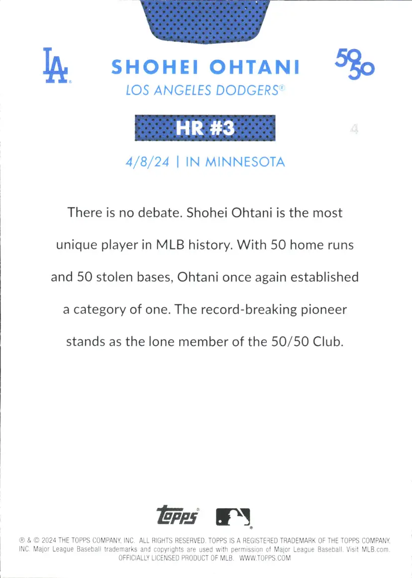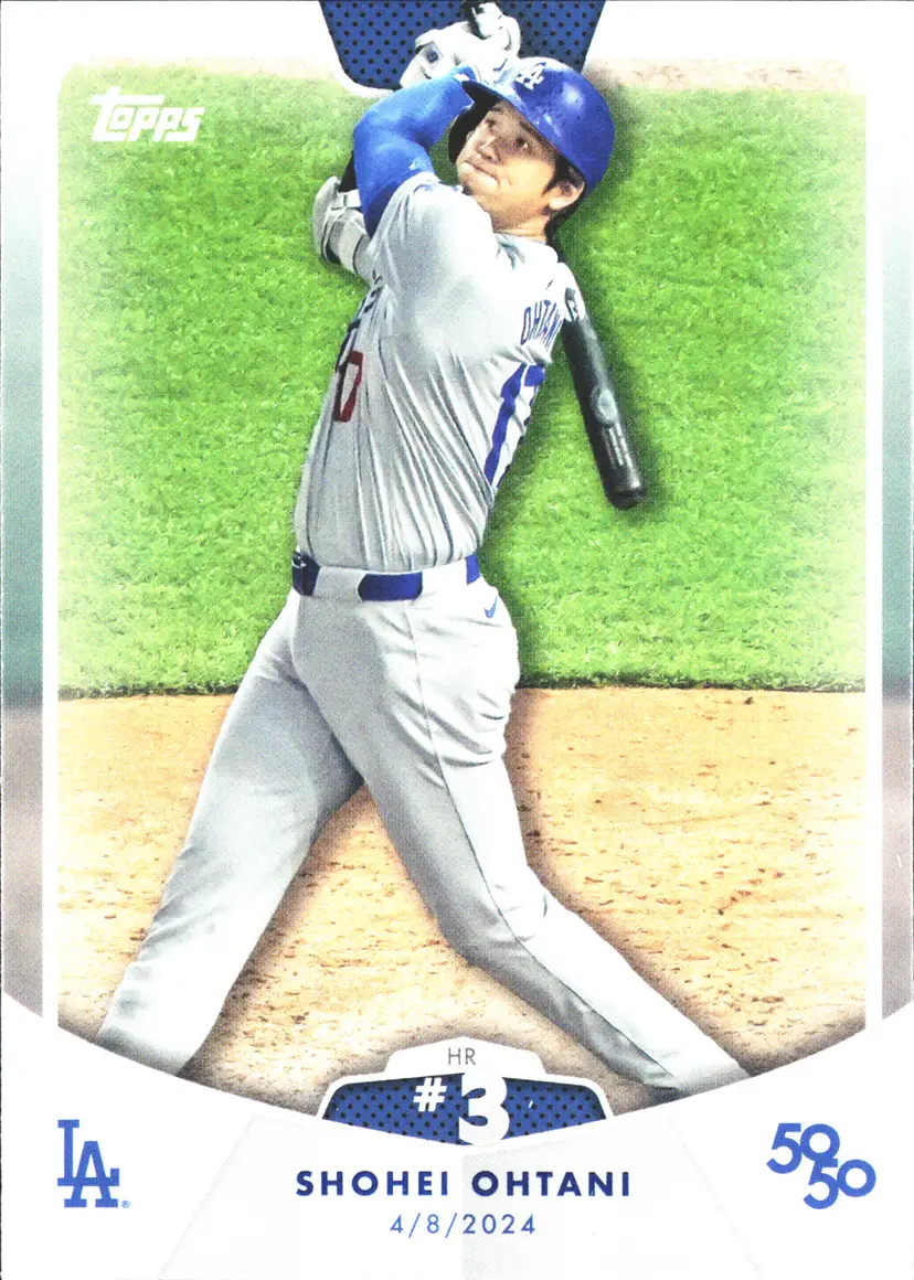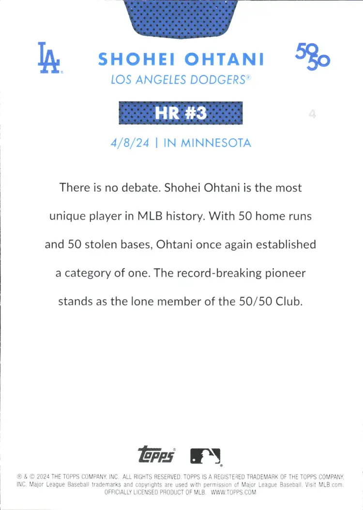 1st time buyer? Get $5 Off with code DISTRICT5 at checkout! Card as shown. All cards $20 and under ship PWE via lettertrackpro [https://www.letter-track.com/registerap.asp?AFID=8757] Type: Sports Trading Card Sport: Baseball League: Major League Baseball (MLB) Autographed: No Set: 2024 Topps 50 Manufacturer: Topps Features: Base Set Player/Athlete: Shohei Ohtani Team: Los Angeles Dodgers Card Number: 4 Season: 2024