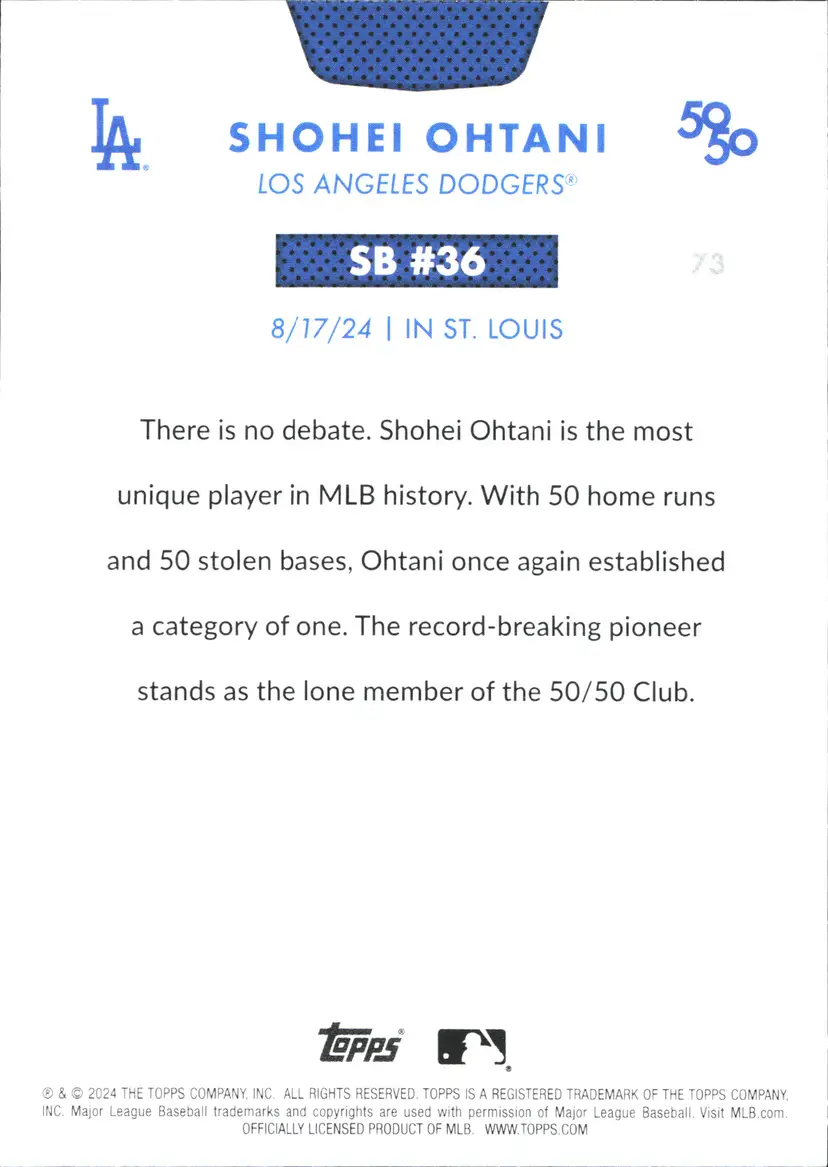 1st time buyer? Get $5 Off with code DISTRICT5 at checkout! Card as shown. All cards $20 and under ship PWE via lettertrackpro [https://www.letter-track.com/registerap.asp?AFID=8757] Type: Sports Trading Card Sport: Baseball League: Major League Baseball (MLB) Autographed: No Set: 2024 Topps 50 Manufacturer: Topps Features: Base Set Player/Athlete: Shohei Ohtani Team: Los Angeles Dodgers Card Number: 73 Season: 2024