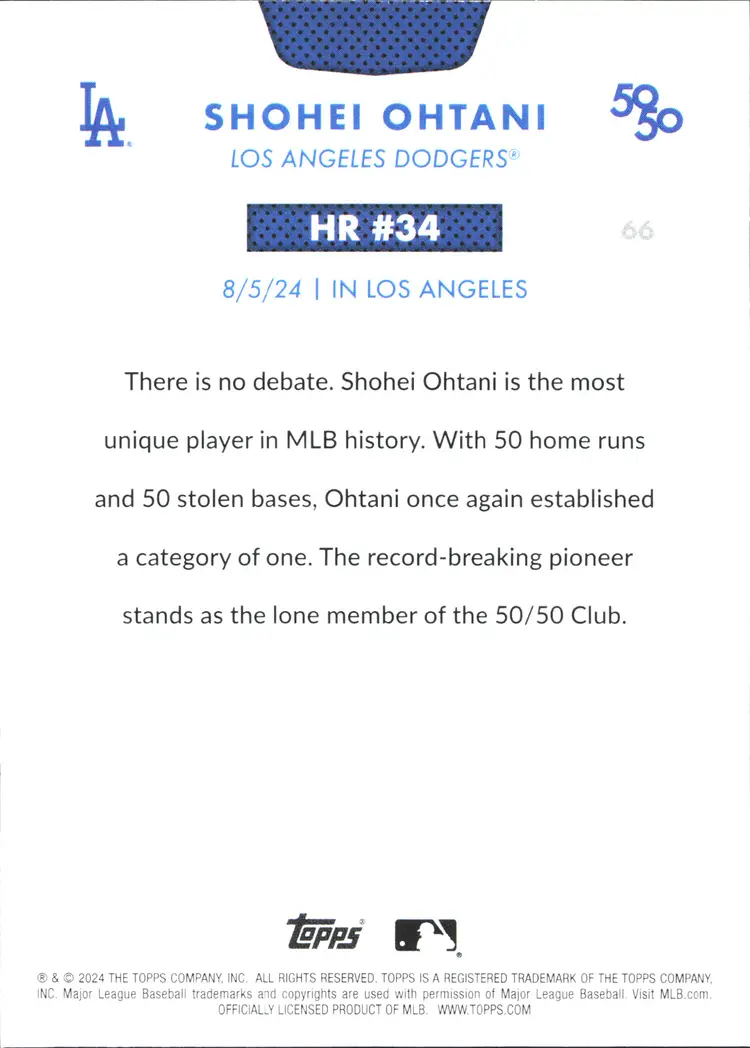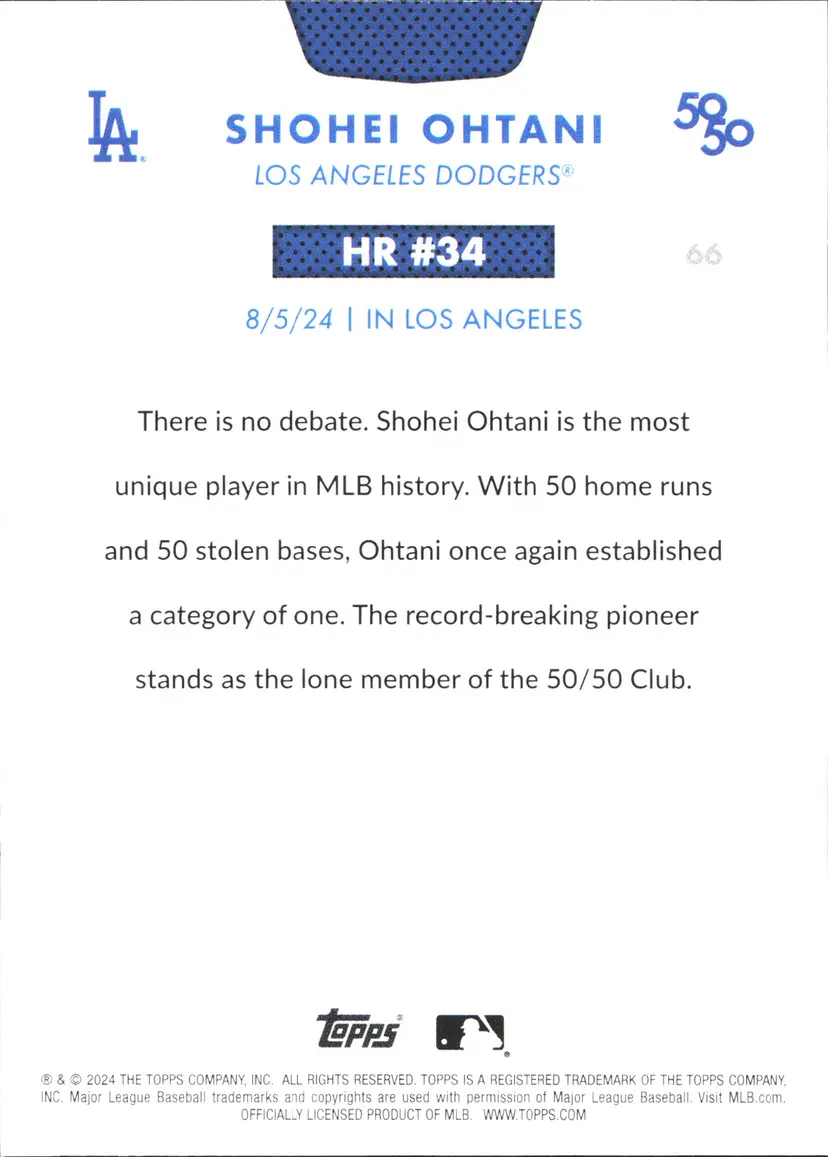 1st time buyer? Get $5 Off with code DISTRICT5 at checkout! Card as shown. All cards $20 and under ship PWE via lettertrackpro [https://www.letter-track.com/registerap.asp?AFID=8757] Type: Sports Trading Card Sport: Baseball League: Major League Baseball (MLB) Autographed: No Set: 2024 Topps 50 Manufacturer: Topps Features: Base Set Player/Athlete: Shohei Ohtani Team: Los Angeles Dodgers Card Number: 66 Season: 2024