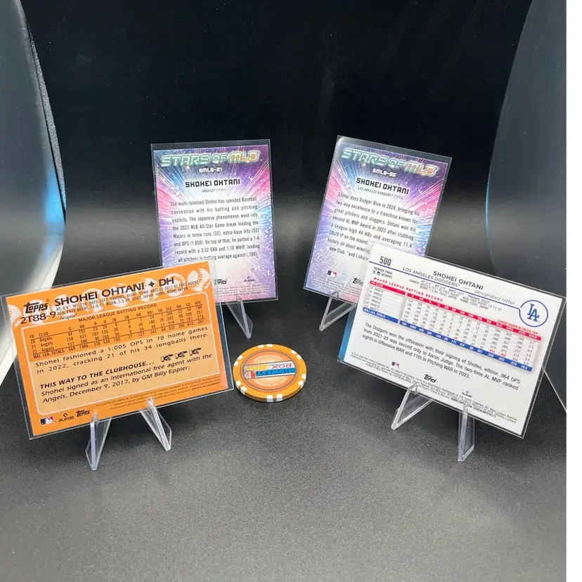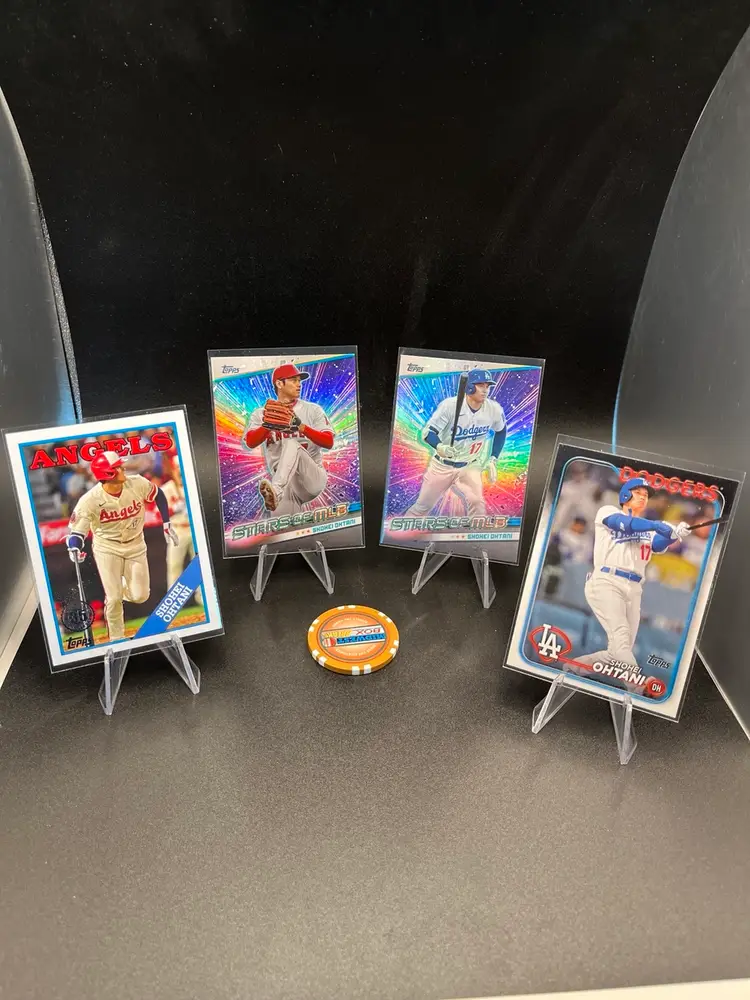 4 Shohei Ohtani cards. 2 from each of his teams. 2023 1988 insert 2024 Angels Stars of the MLB 2024 Dodgers Stars of the MLB 2024 topps base Dodgers card.