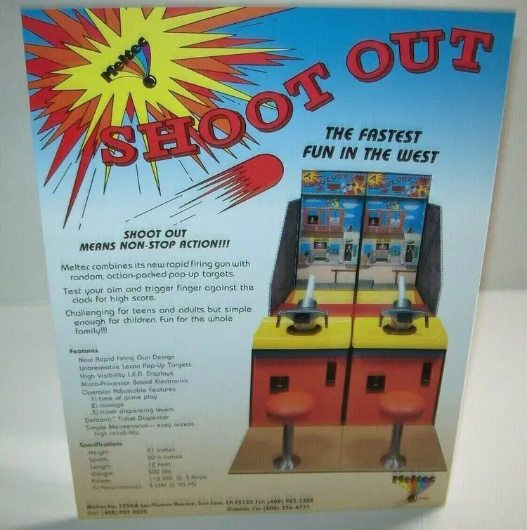Arcade: Flyer Country/Region of Manufacture: United States Original/Reproduction: Original Year: Unknown Game Title: Shoot Out Brand: Meltec Inc.