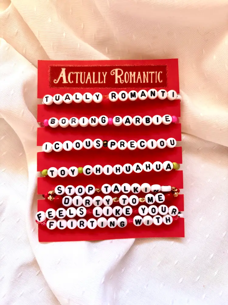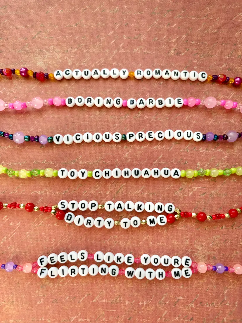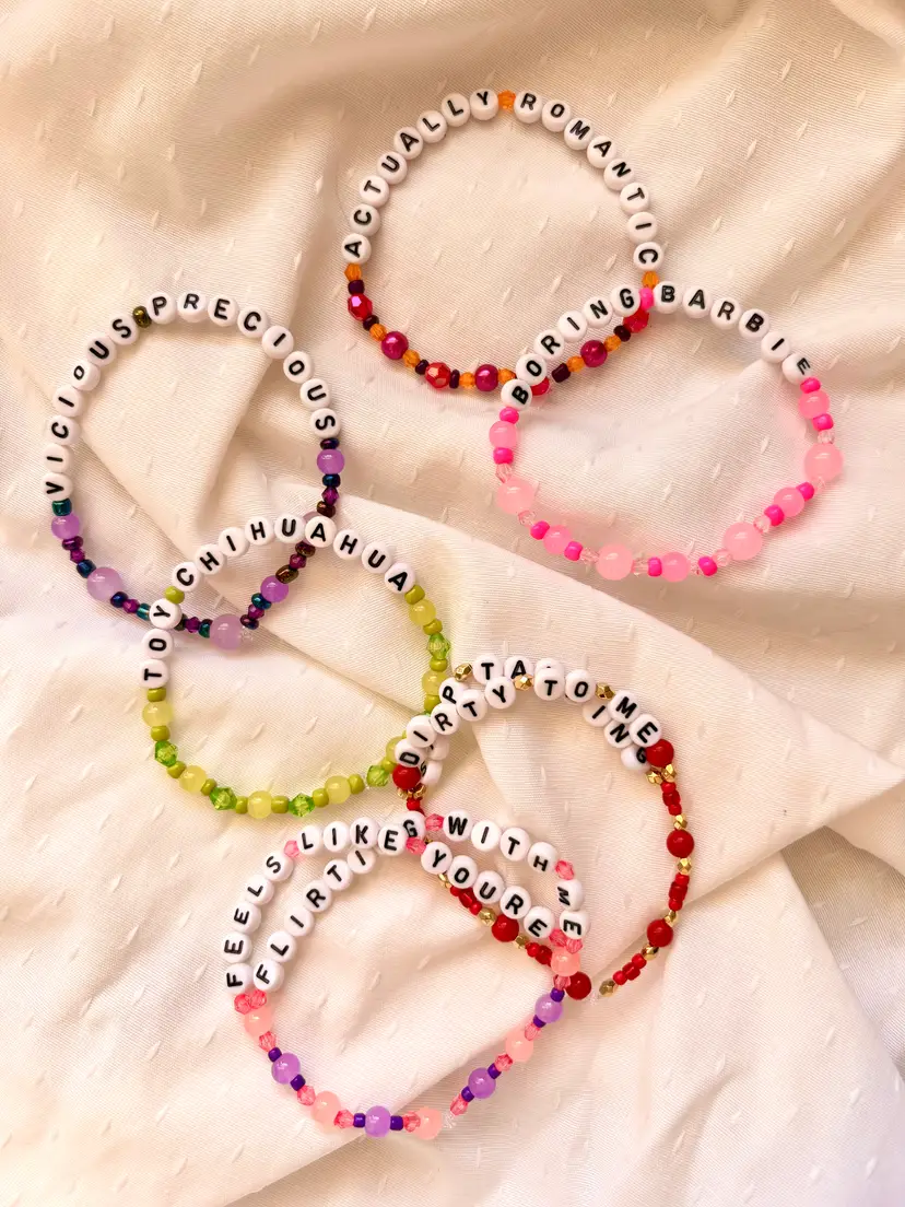 It’s actually sweet! It’s honestly wild! Be vicious, precious, and adorable with this "Actually Romantic" inspired bracelet set! 👜The bracelets you receive will say the same lyrics as those in the pictures. The set includes three double-strand bracelets. The bracelets are made with stretch elastic and do not have clasps. They are each approximately 6.5 inches in length.