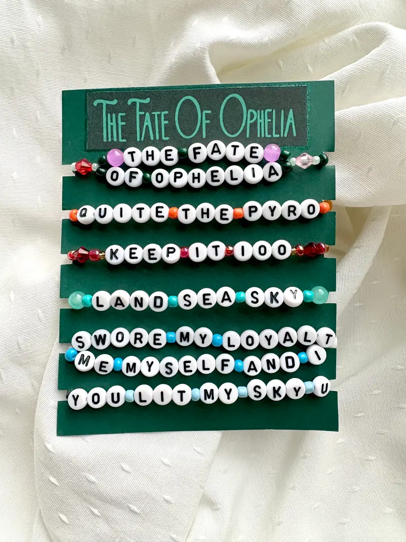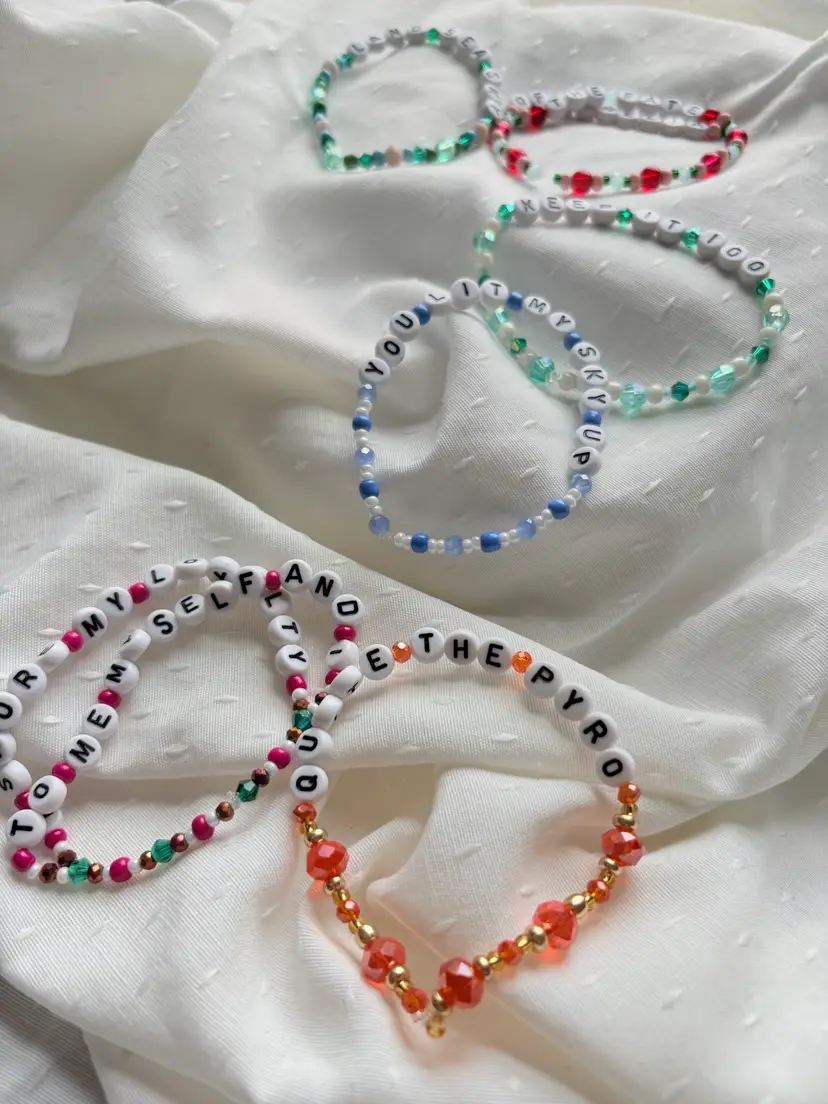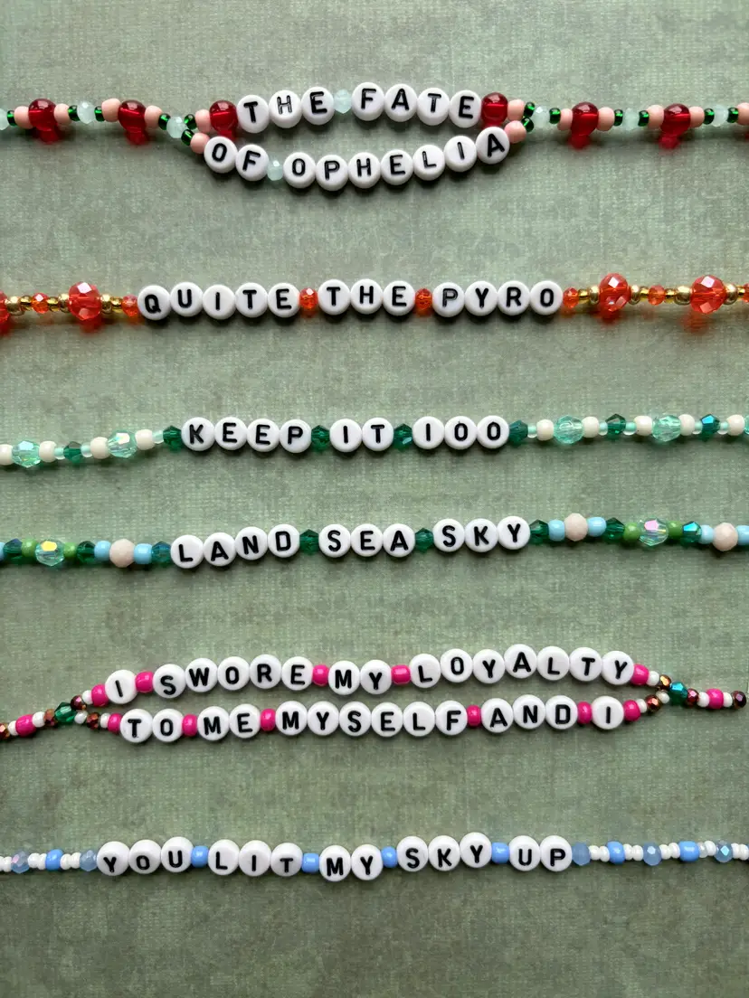 Keep it 💯 in style with this bracelet set! The bracelets you receive will say the same lyrics as those in the pictures. The set includes two double-strand bracelets. The bracelets are made with stretch elastic and do not have clasps. They are each approximately 6.5 inches in length.