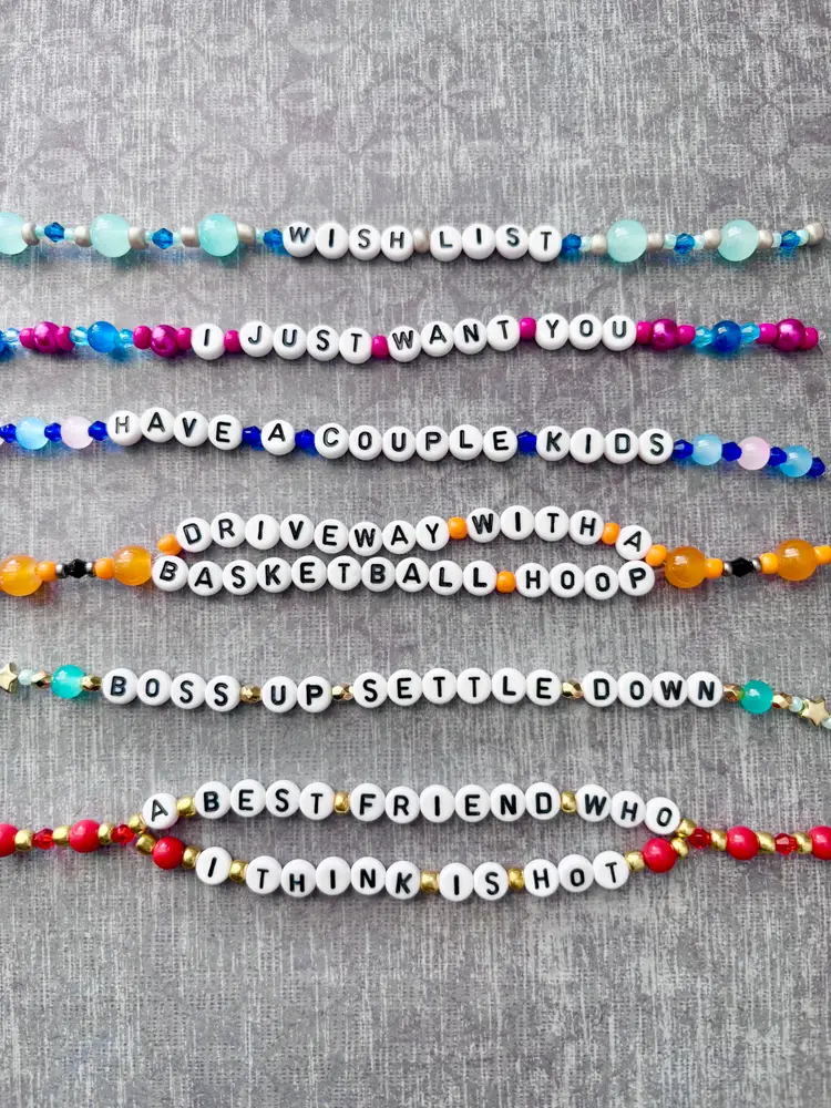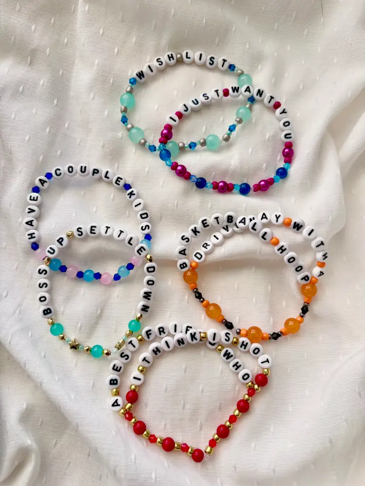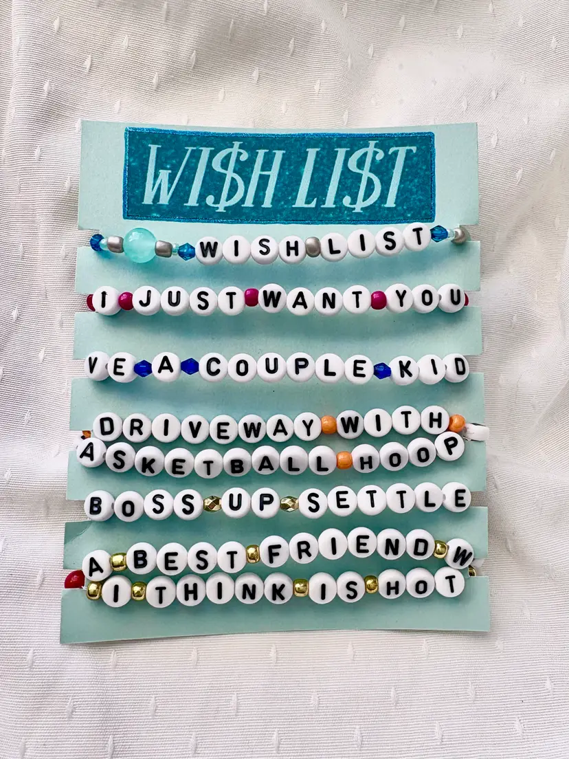 Who needs Balenci' shades or an Oscar on the bathroom floor when you can add this bracelet set to your wi$h li$t? ๐ The bracelets you receive will say the same lyrics as those in the pictures. The set includes two double-strand bracelets. The bracelets are made with stretch elastic and do not have clasps. They are each approximately 6.5 inches in length.