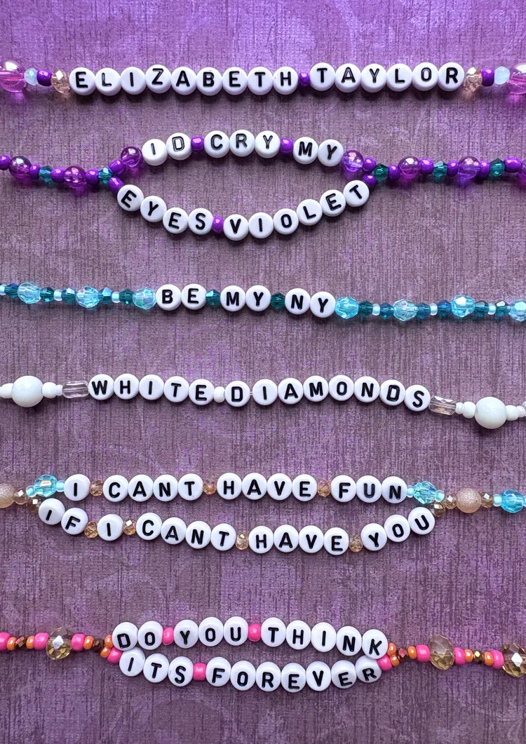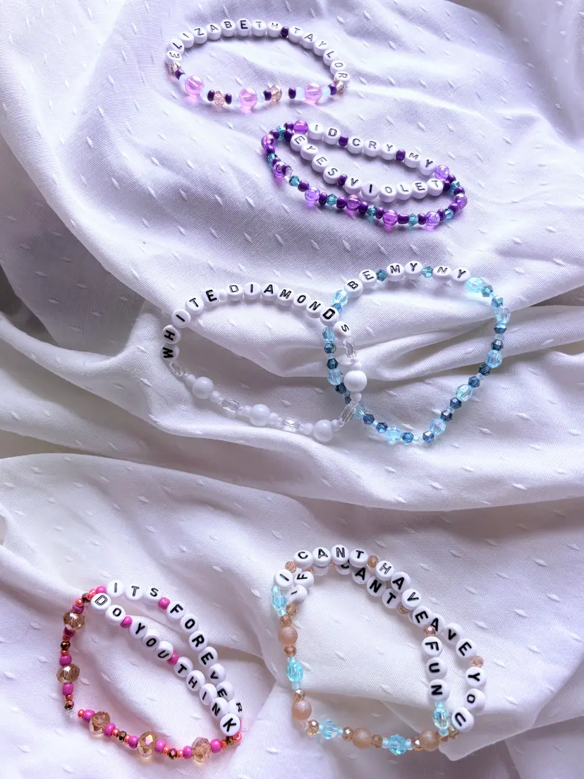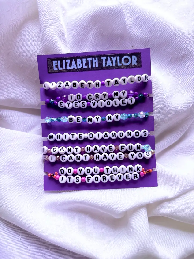 You can't have fun if you can't have this "Elizabeth Taylor" inspired bracelet set! ๐ The bracelets you receive will say the same lyrics as those in the pictures. The set includes three double-strand bracelets. The bracelets are made with stretch elastic and do not have clasps. They are each approximately 6.5 inches in length.