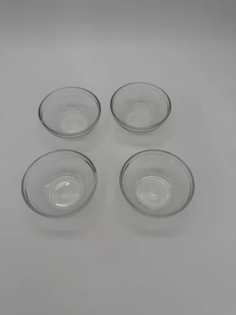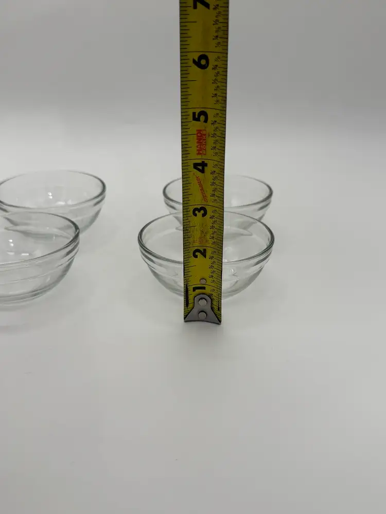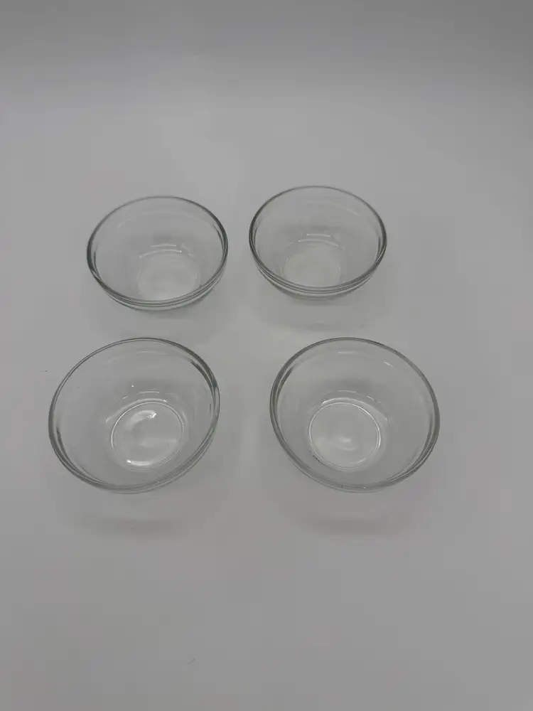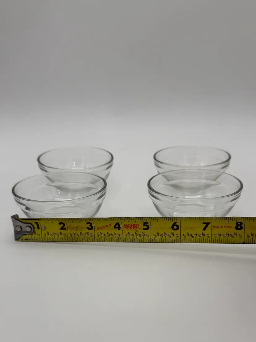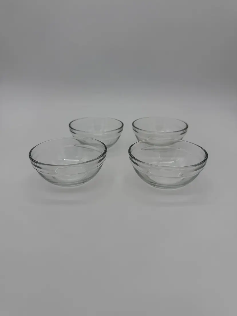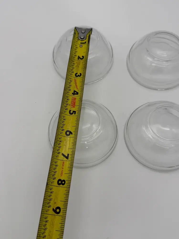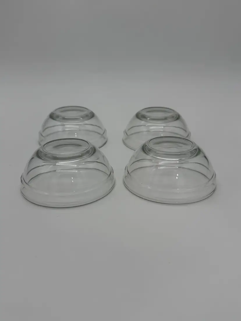 This vintage set of four clear glass shrimp cocktail serving bowls features a solid, ribbed pattern in a round shape. Each bowl has a diameter of 3.5 inches and a depth of 1.5 inches, making them perfect for all occasions. These stackable bowls are unmarked and have a shiny finish, adding a touch of elegance to your table setting. With a total weight of 14.4 ounces, this set includes everything you need to serve your favorite shrimp cocktail in style. Very good condition!