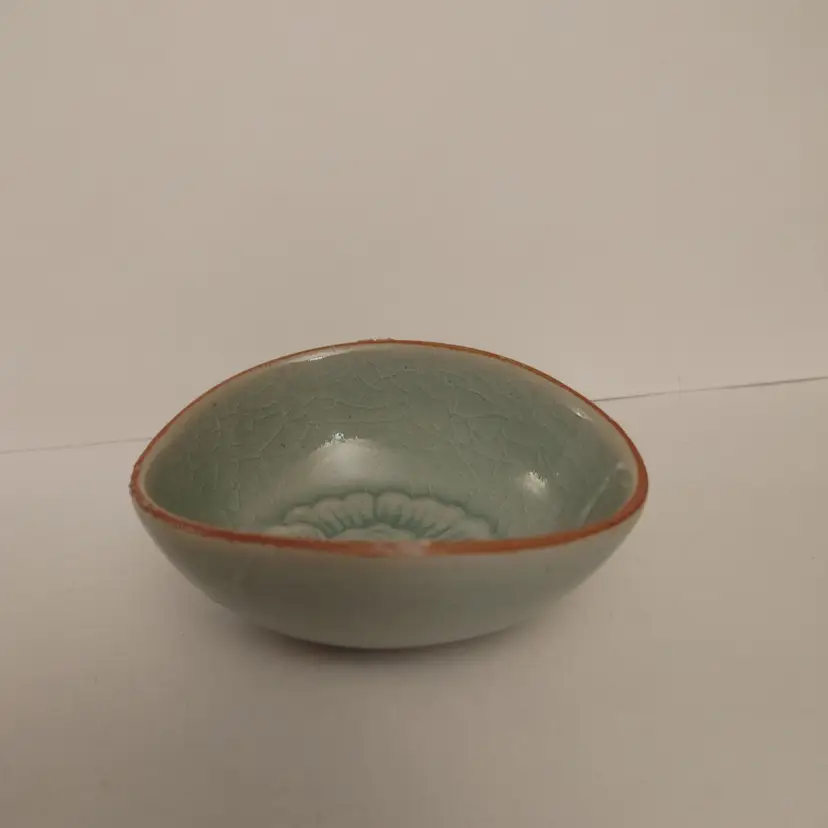 Siam Celadon small trinket dish. Wood ash glaze. Made in Thailand. Has crazing. 3.5 x 3 x 1.5 high.