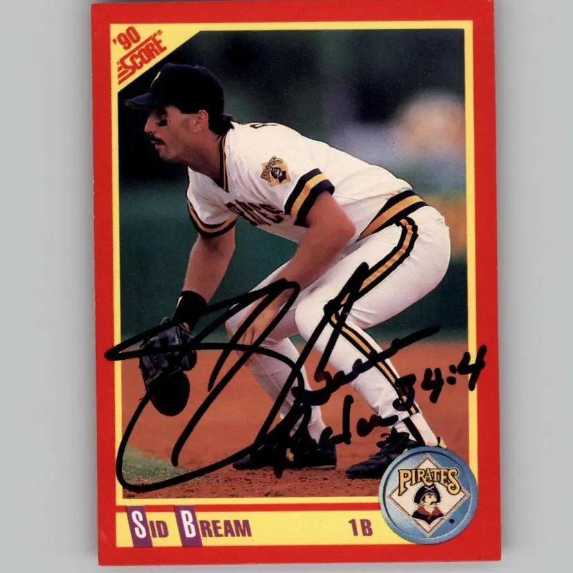 Authentic 1990 Score baseball card featuring Sid Bream of the Pittsburgh Pirates, adorned with his signature. A treasured item for Pirates fans and autograph card collectors. Your purchase aids Signatures For Soldiers in their mission to support homeless and disabled veterans.