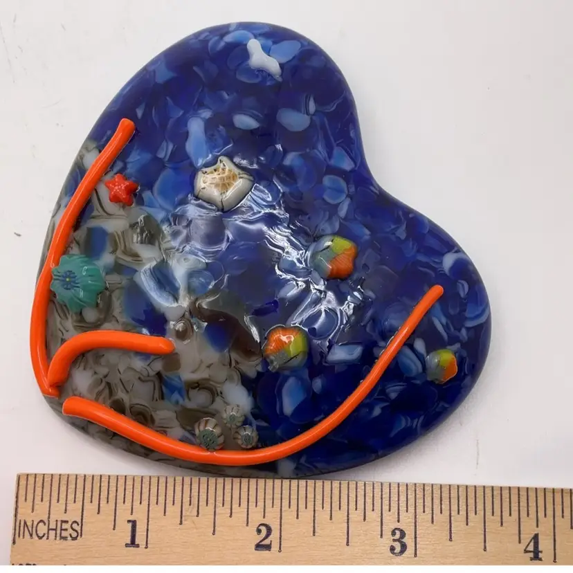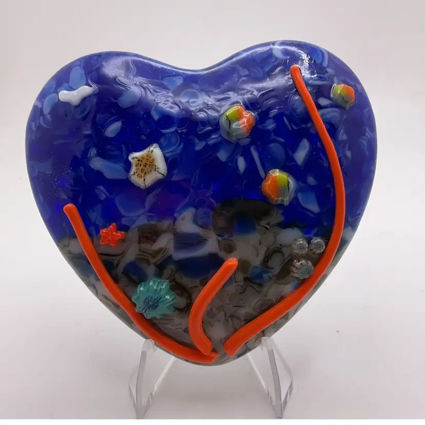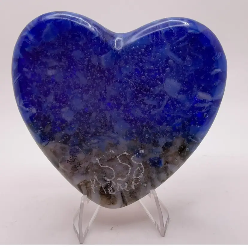 Fused glass heart paperweight, kiln made with love by me! Each heart is unique and varies in color placement, bubbles and depth of field. Shiny on the front, textured on the back, approximately 3.5 x 3.75-inches. Made with Bullseye glass and pieces from a variety of artists. Plastic easel included for display. SIGNED BY ME: SSS AleneR
