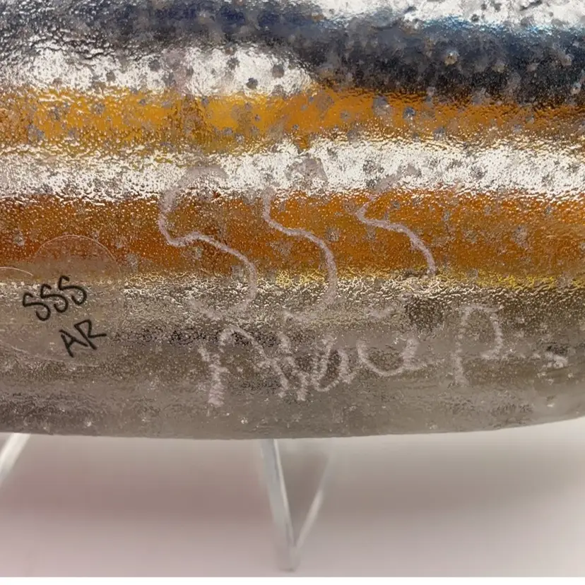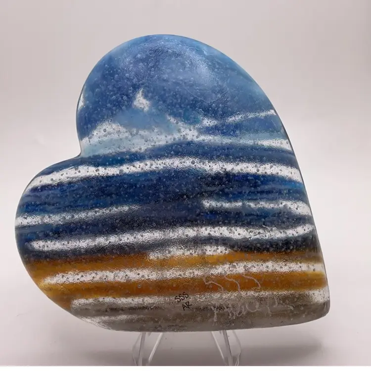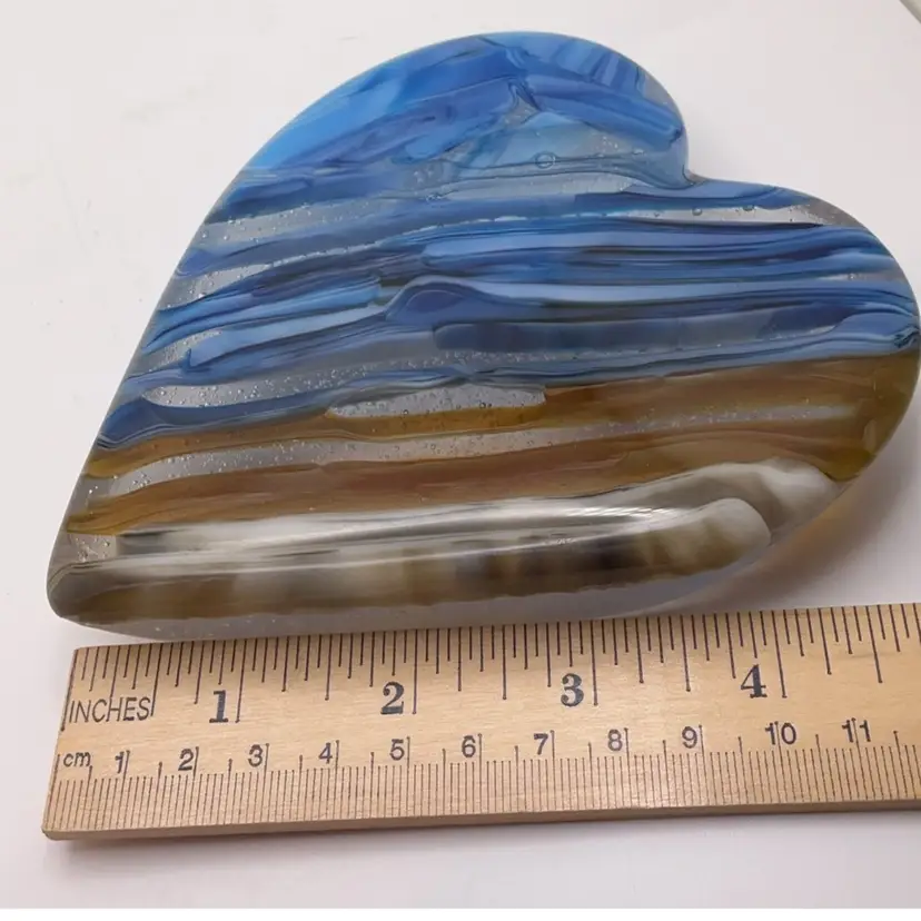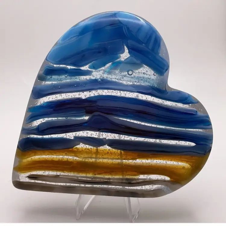 Large, fused glass heart paperweight, kiln made with love by me! Each heart is unique and varies in color placement, bubbles and depth of field. Shiny on the front, textured on the back, approximately 5 x 4 1/4-inches; weighs approximately 510 grams. Made with a variety of layered Bullseye glass pieces. Will need a flat, level surface for display, not really a true paperweight. Displays best with light from behind. Plastic easel included for display. SIGNED BY ME: SSS AleneR