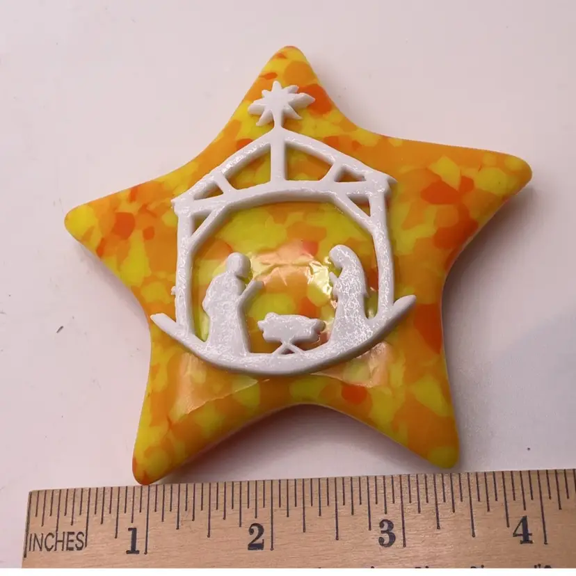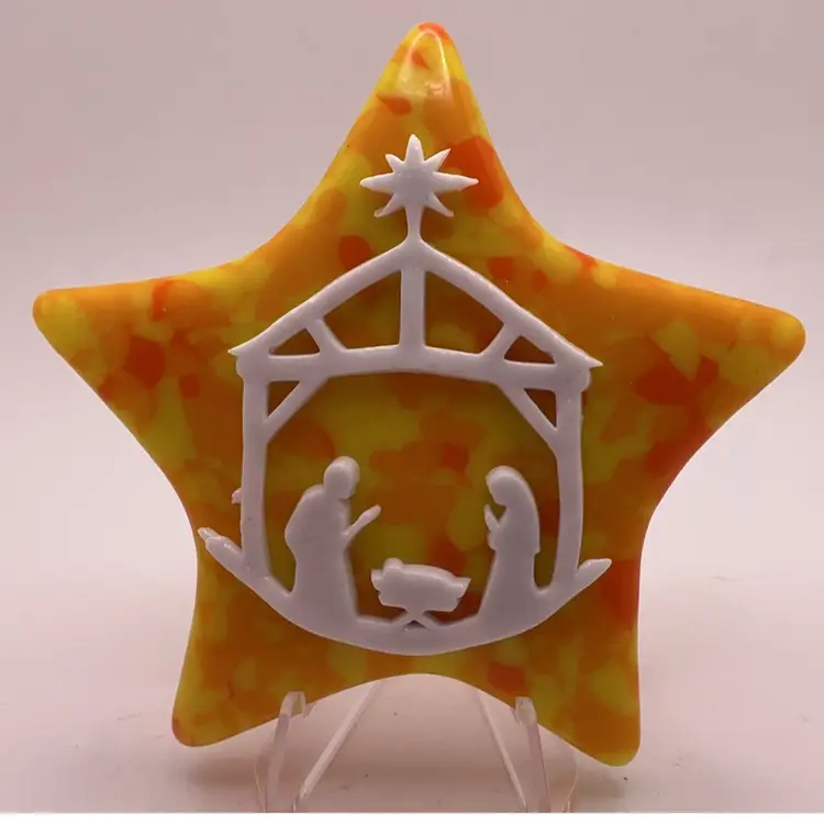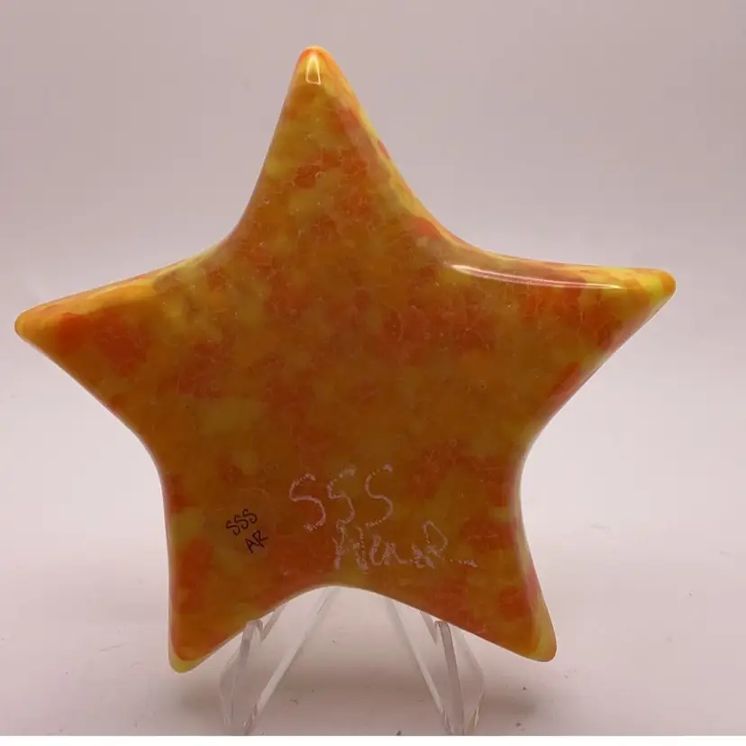 Fused glass star paperweight, kiln made with love by me! Each star is unique and varies in color placement, bubbles and depth of field. Shiny on the front, textured on the back, approximately 3.75” x 3.75-inches. Made with Bullseye glass and freeze and fuse element from another artist. Plastic easel included for display. SIGNED BY ME: SSS AleneR