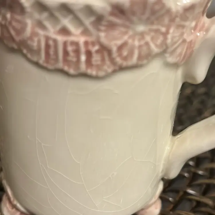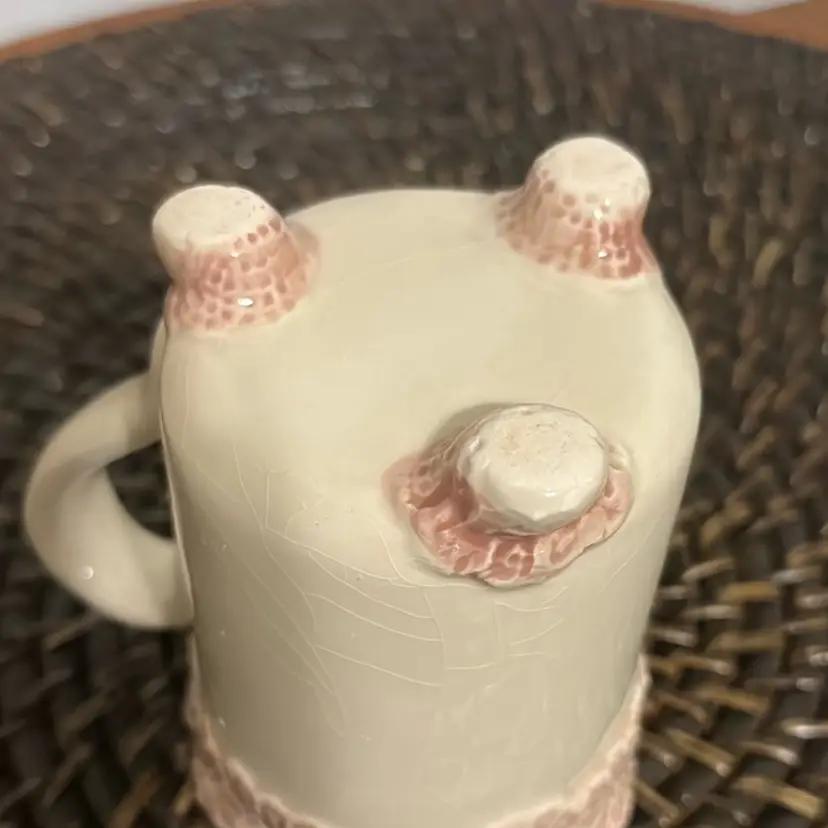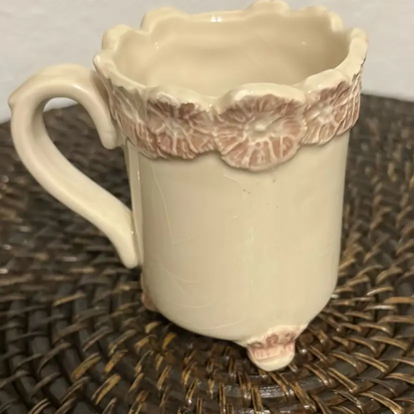 This is a vintage Sigma The Tastesetter Belle Epoque coffee or tea mug made in Japan. It features a distinctive ruffled rim with a pink floral relief design. The mug is off-white or cream-colored and stands on three small feet. "Sigma The Tastesetter" was a brand known for hand-decorated ceramics, popular in the 1970s and 1980s. Items from this collection are considered rare and hard to find.