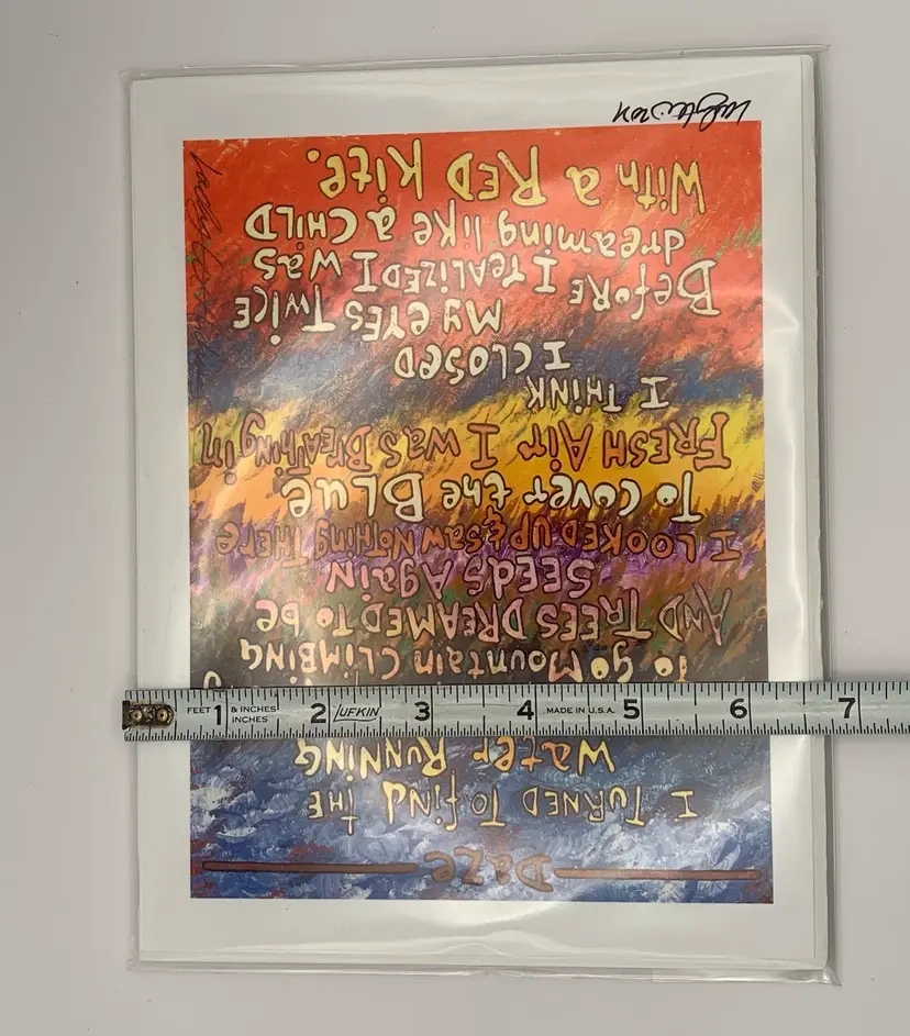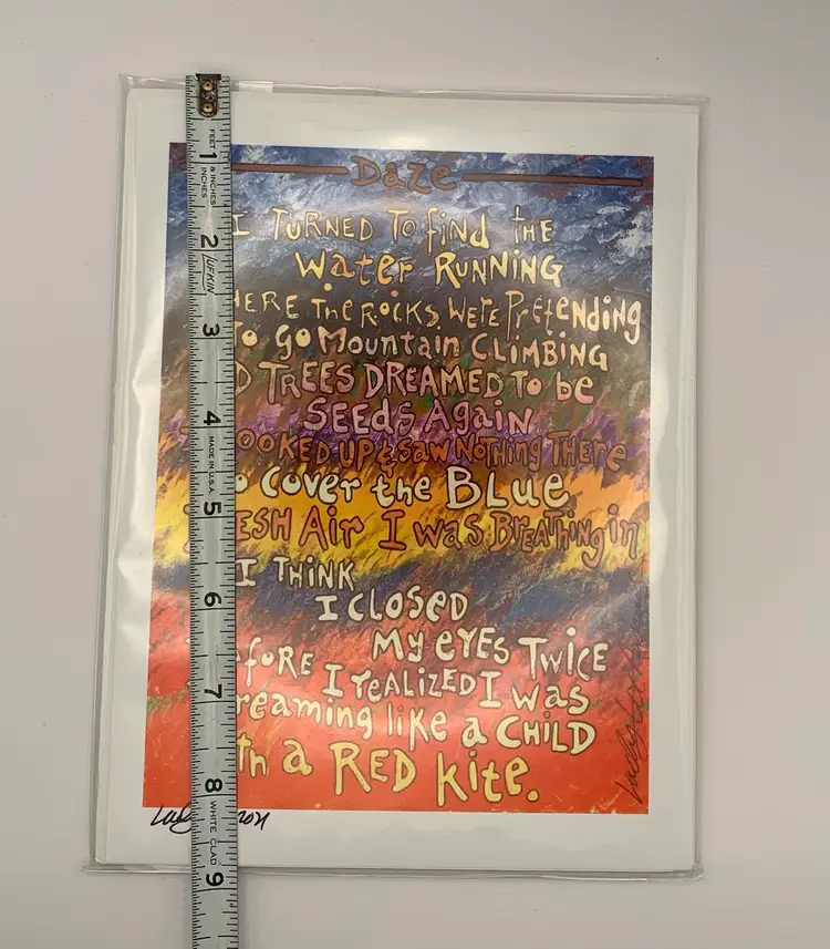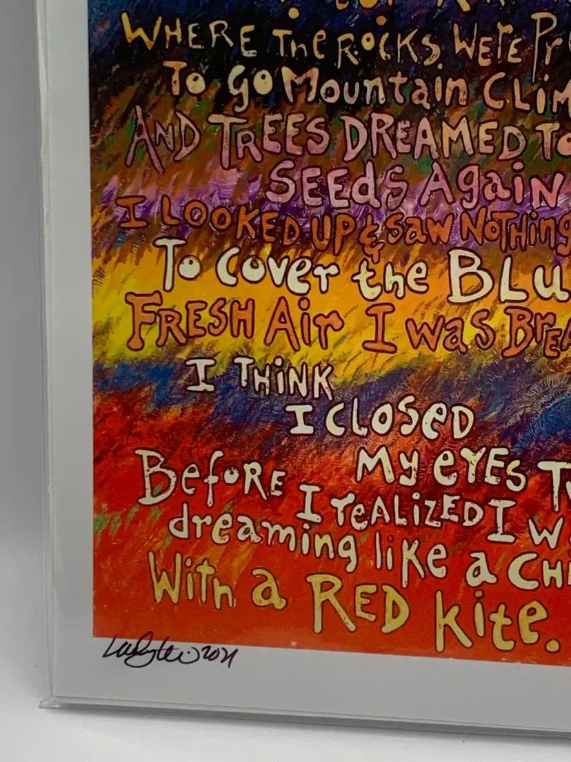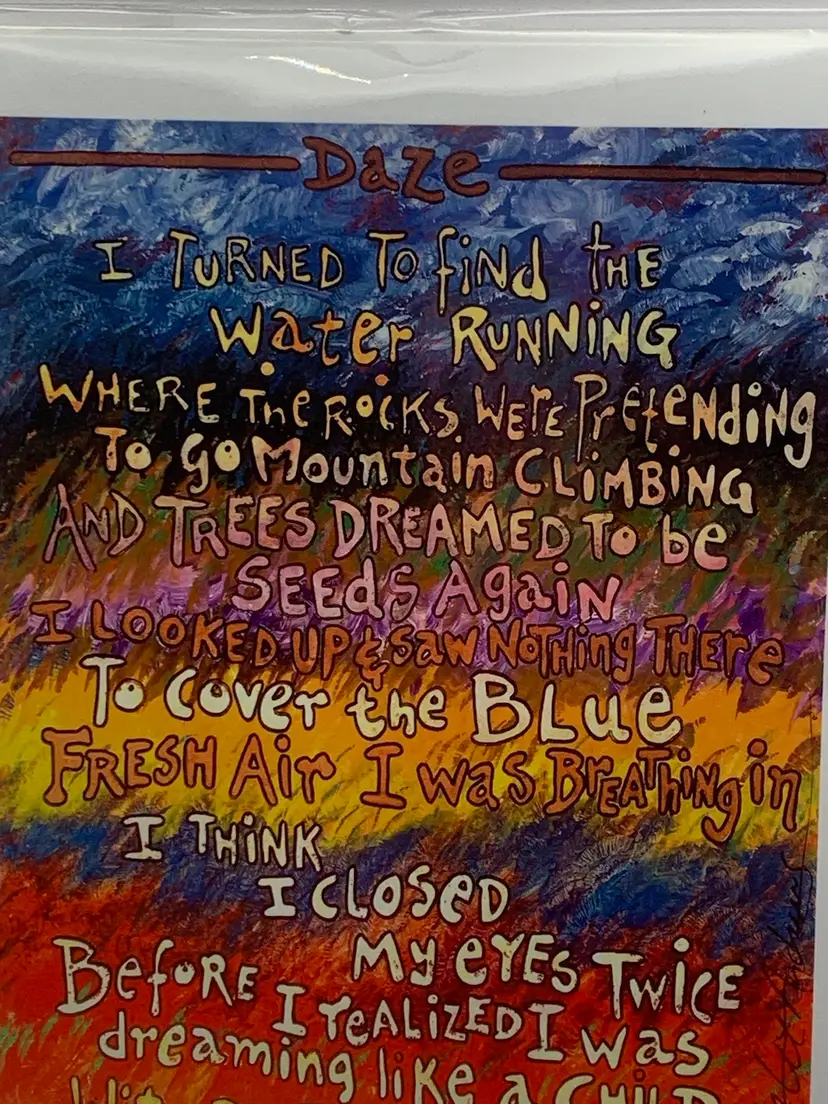 This poem starts. “I turned to find the water running where the rocks were pretending to go mountain climbing….” printed in color and signed by the poet at the bottom. Includes information about the artist. Please see all photos for condition details and measurements. Thanks for checking out my listings.