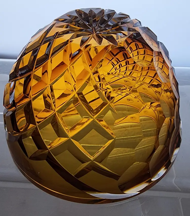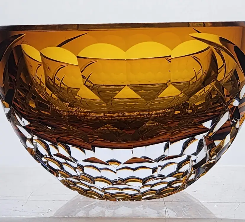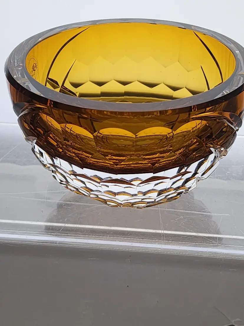 Hand Cut Amber glass bowl Signed by Peter O’Rourke. Each cut is hand polished. 6" in diameter 4" high. In new condition