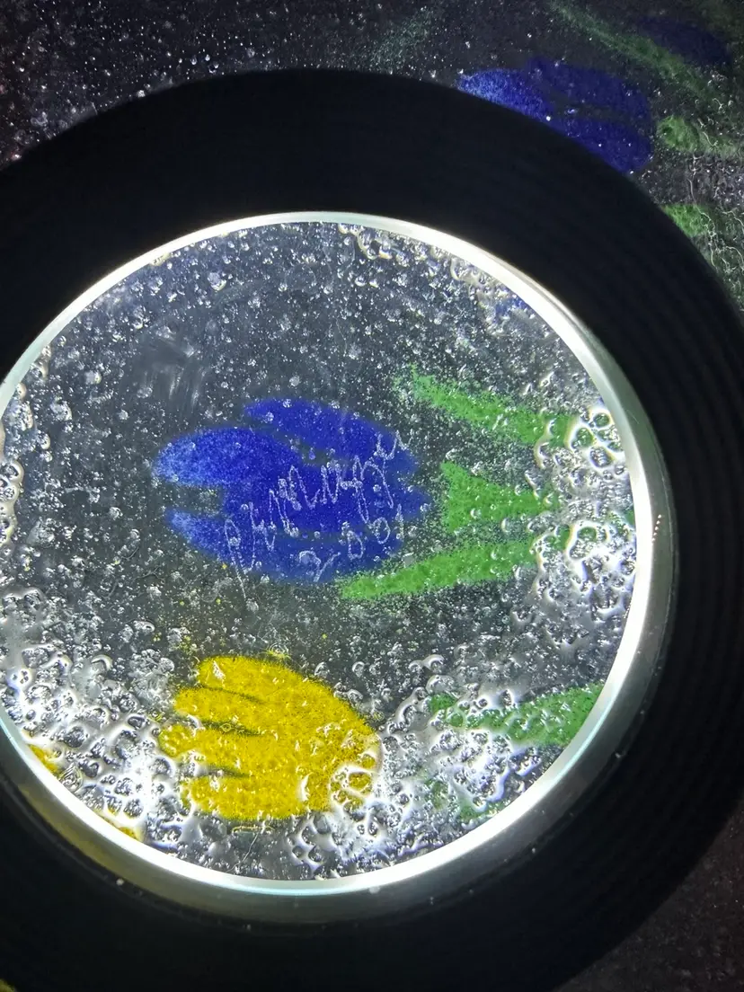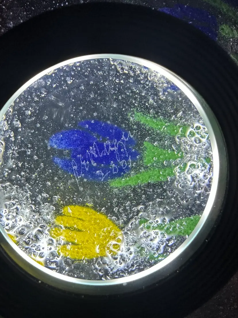 A pretty square glass plate. It is not flat but concave. Smooth on the front and textured on the back with bubbles. I don’t know a lot about this piece. It is signed on the back, but I couldn’t read the signature. And I do not know if this is considered painted glass or fused glass. I’m kinda new at this. But I saw it and thought it was very pretty. It measures 10 1/2“ x 10 1/2“. No chips or cracks.