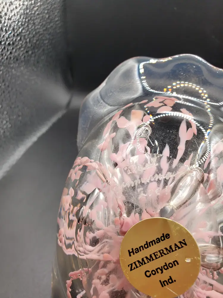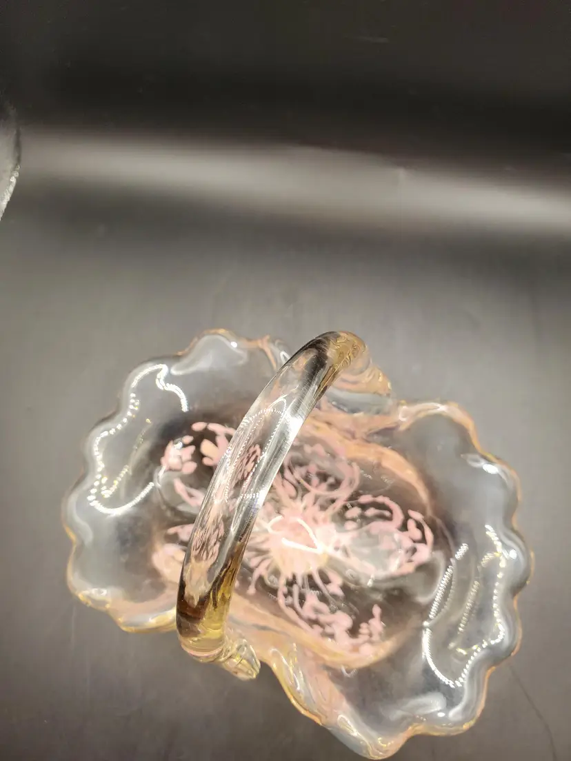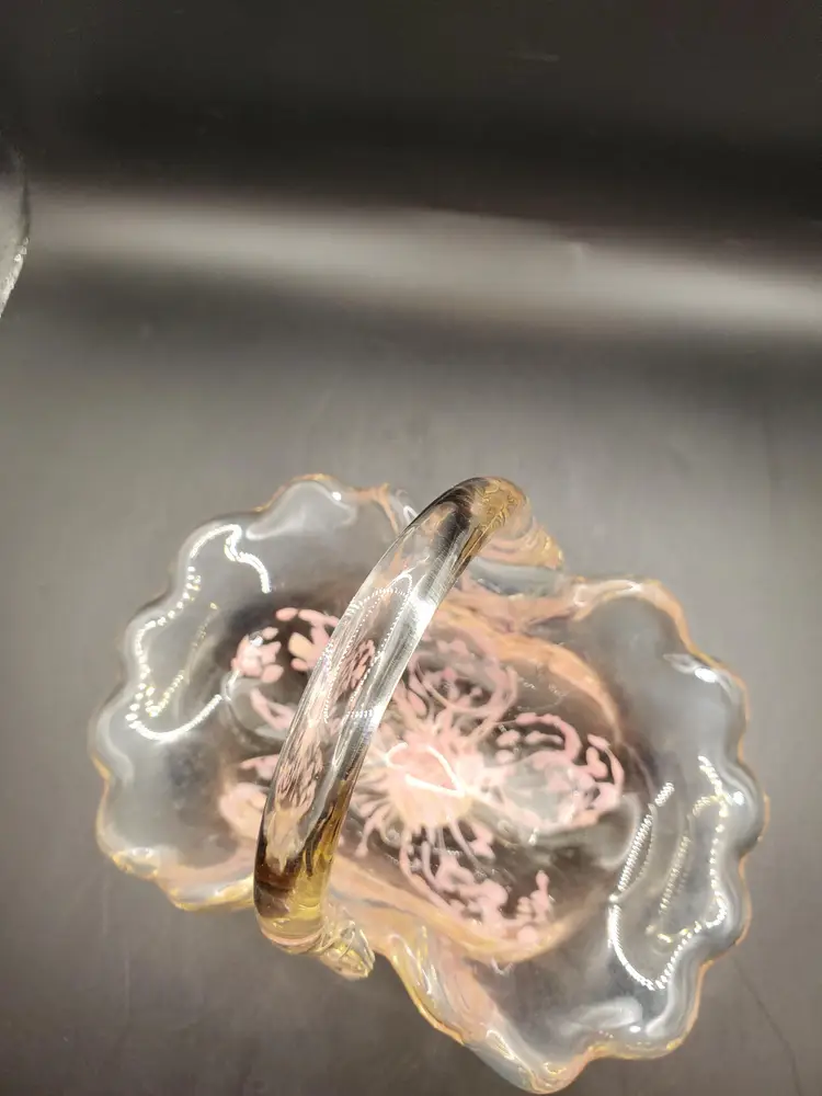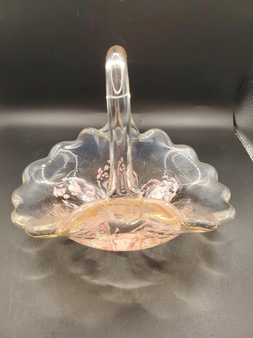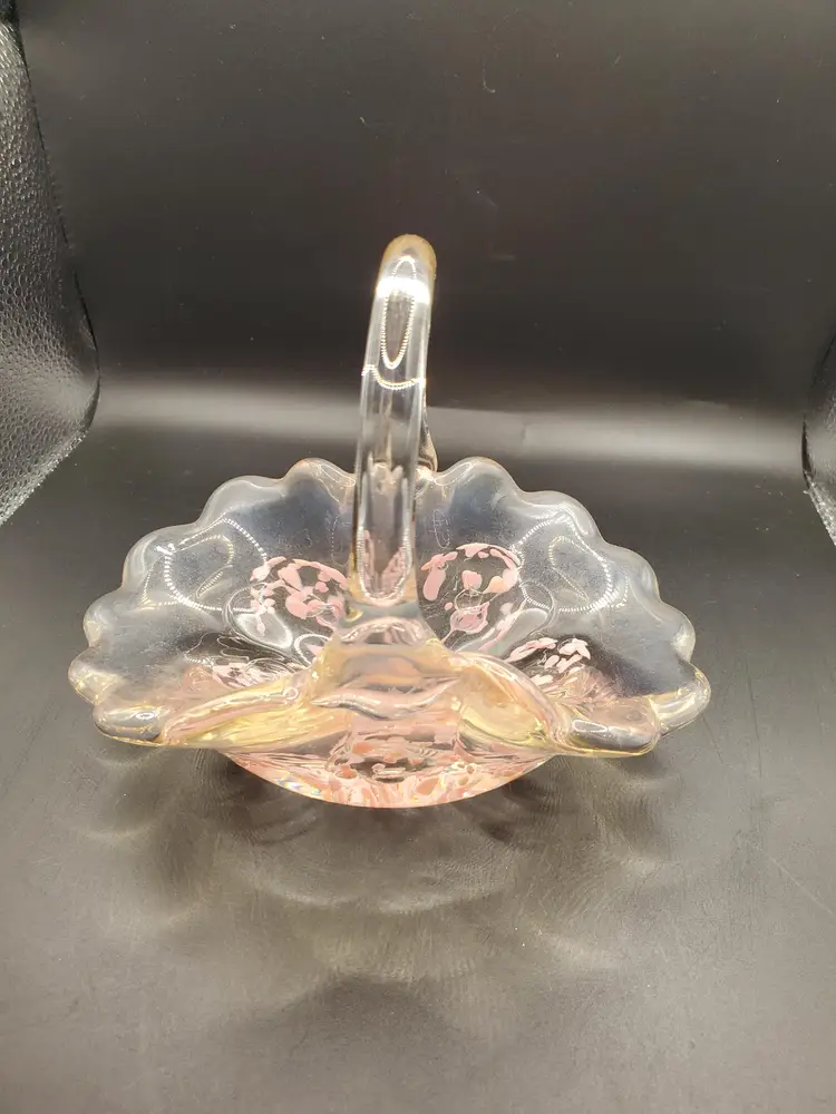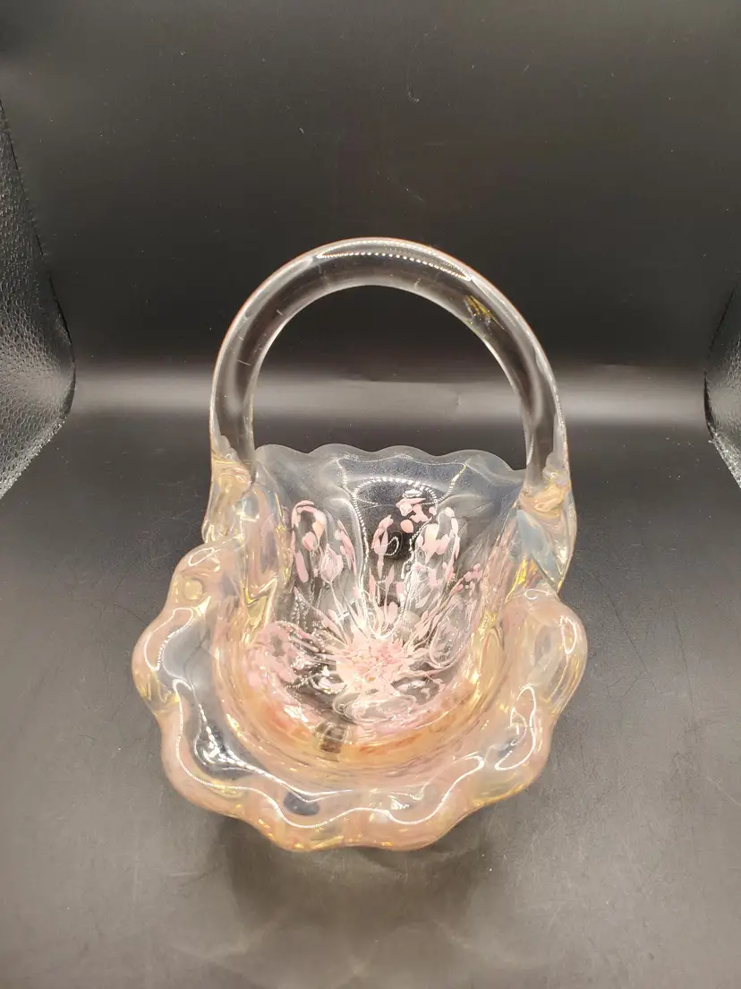 Pretty pink splash basket signed and dated. Original sticker. 6" long by 4" wide by 6" tall to top of handle. Very pretty!