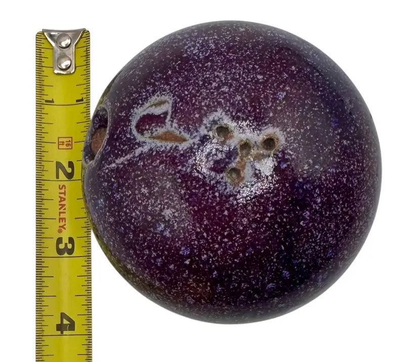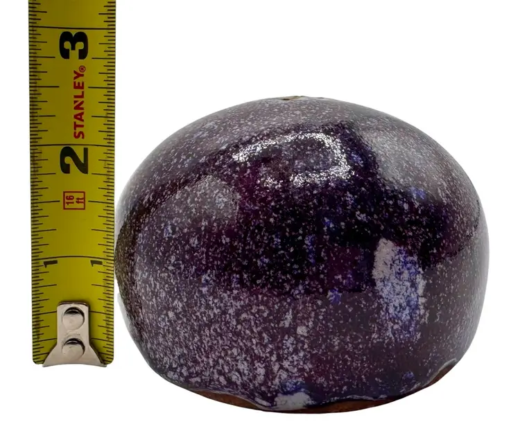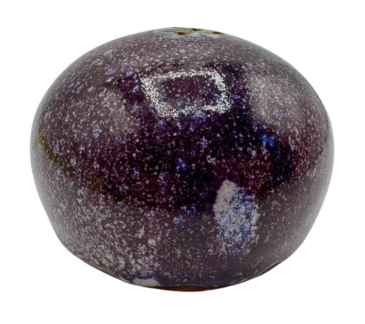Unique round pottery vessel with small hole on the side. It has a plum purple glaze with lighter speckles, and an impressed flower design on the top.