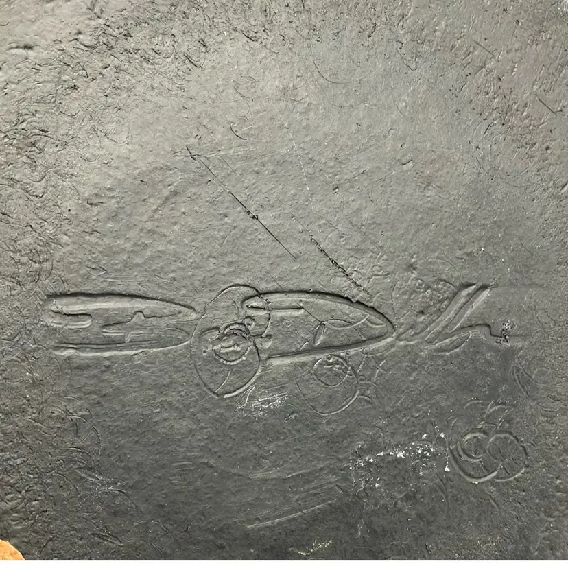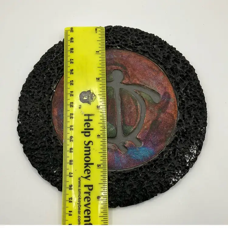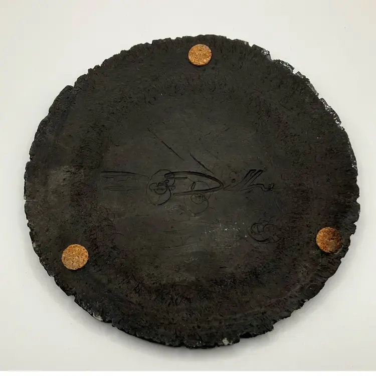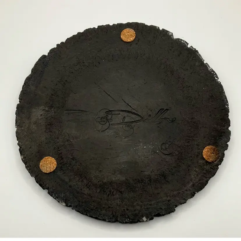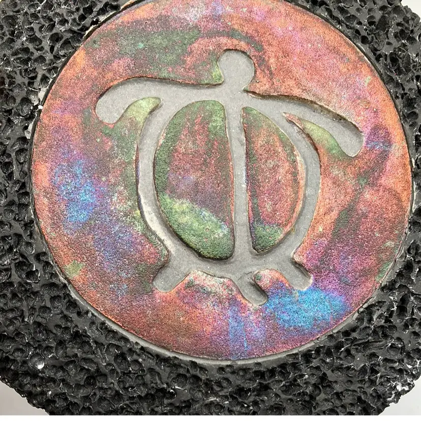 Beautiful example of Diller Raku art. Colorful turtle design with lava rock border. Signed Ben Diller on back. Has 3 thin cork pads on back so could be used as a trivet. Approx. diameter of 6.25” The black porous lava rock border does have a few spots of white that must be the result of the material and process to create this unique piece of Raku art