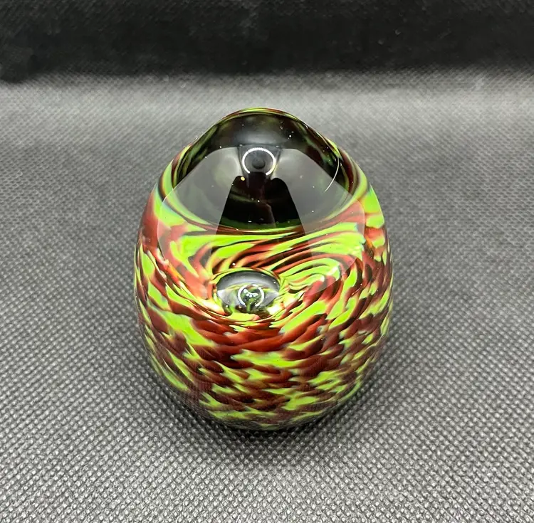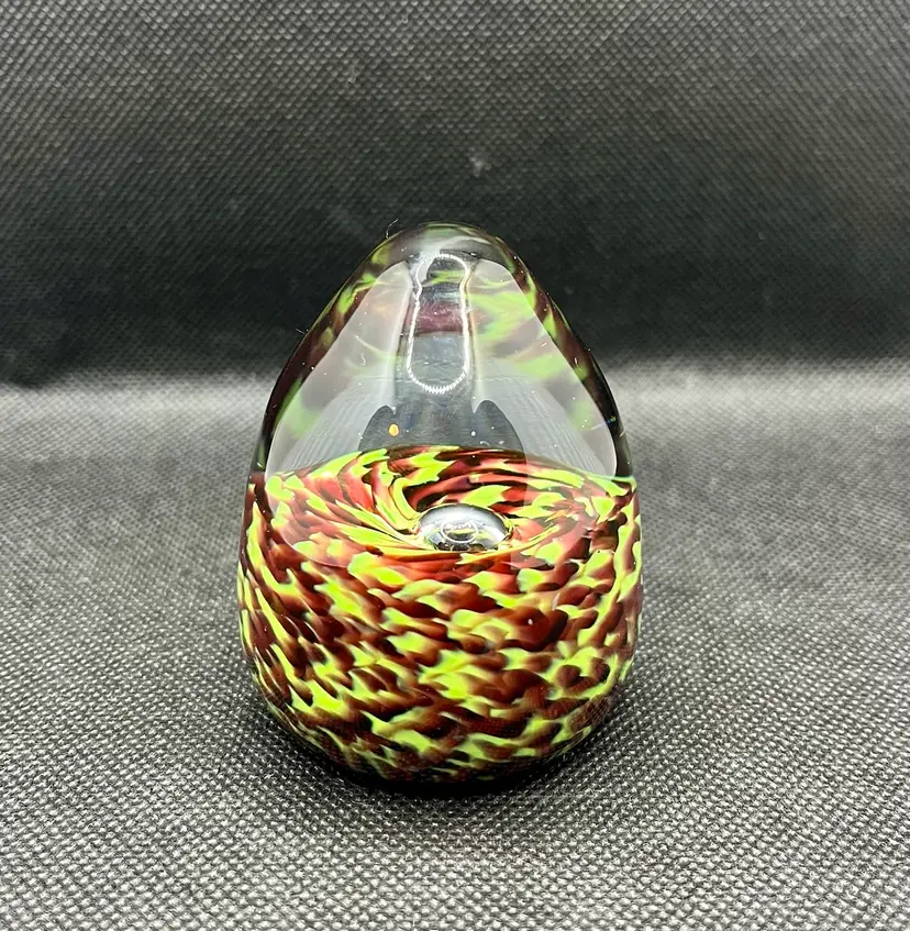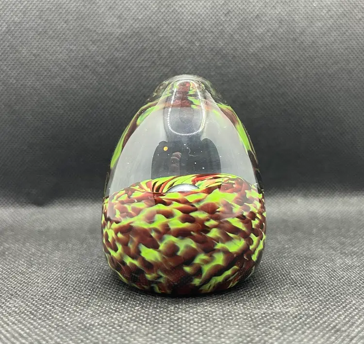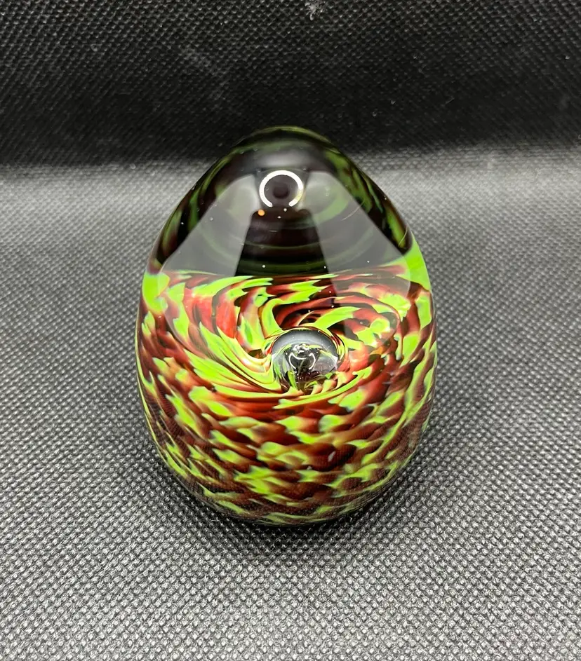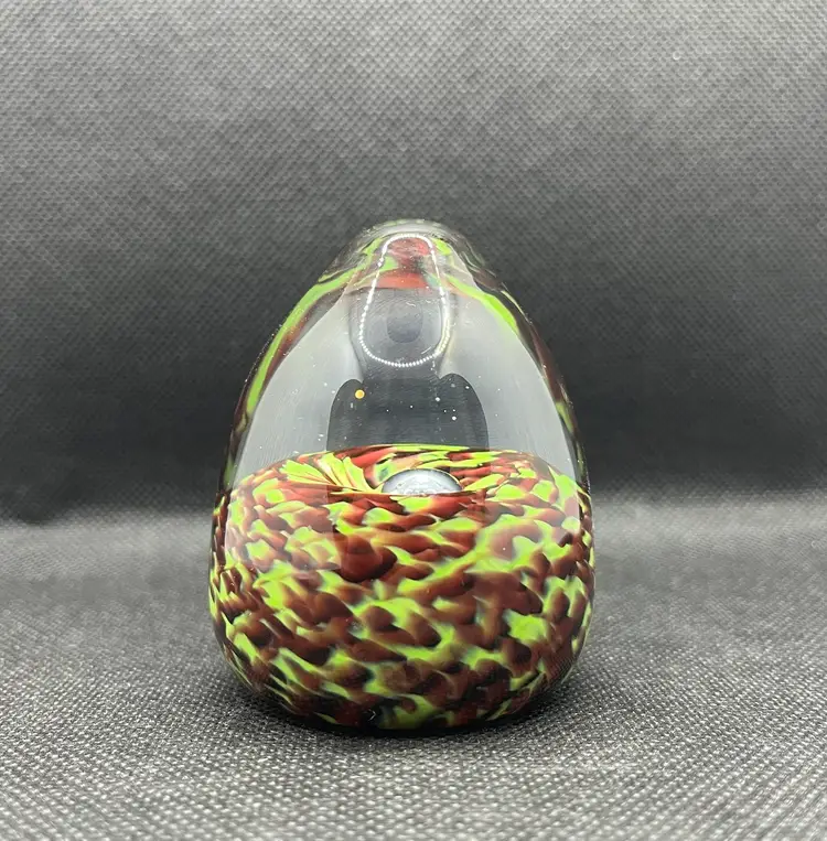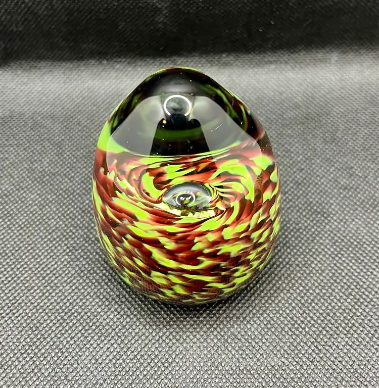 Signed Bogenrief Studios green brown confetti art glass egg shaped paperweight. May have minor surface wear or scratches. No chips, cracks or bruises.