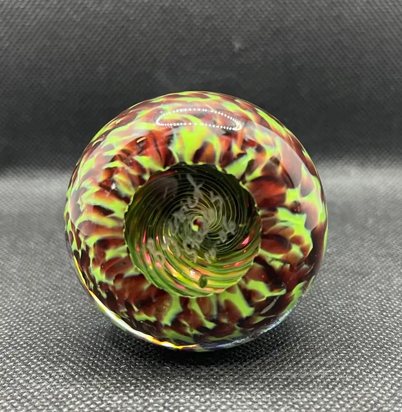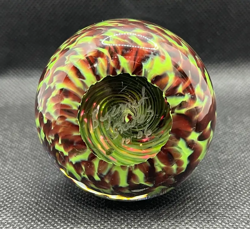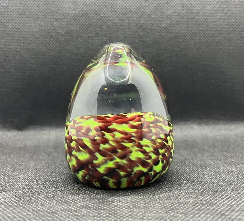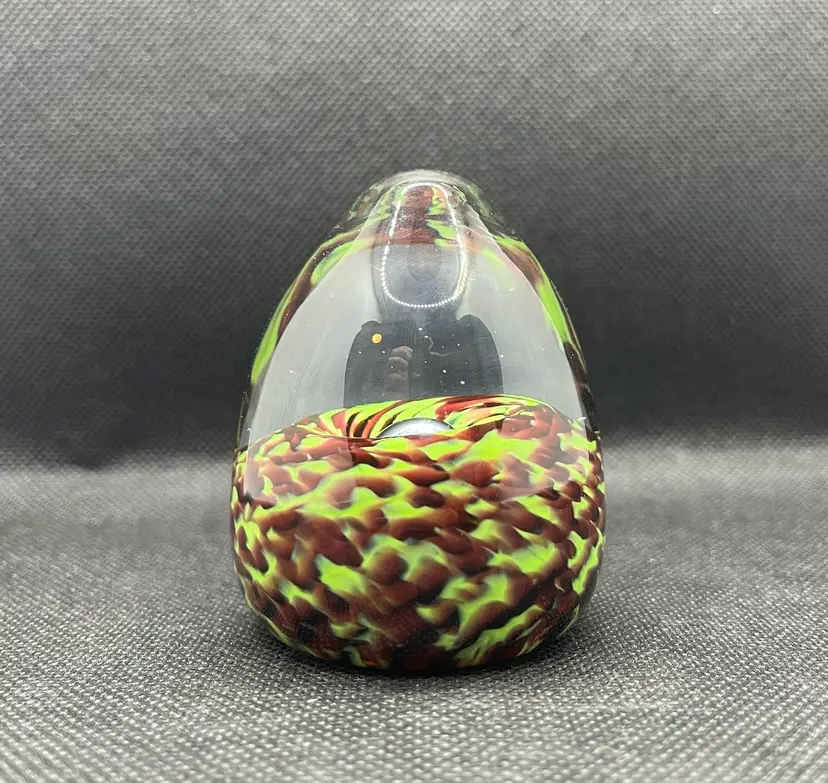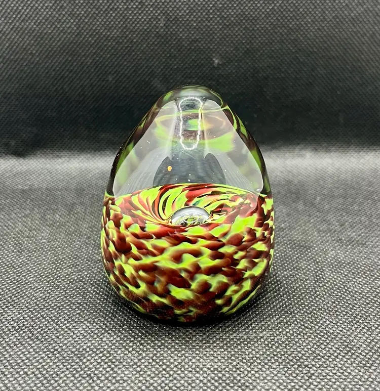 Signed Bogenrief Studios green brown confetti art glass egg shaped paperweight. May have minor surface wear or scratches. No chips, cracks or bruises.