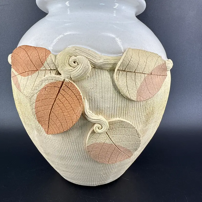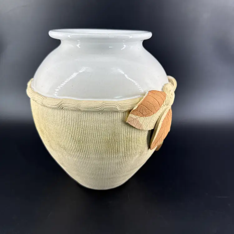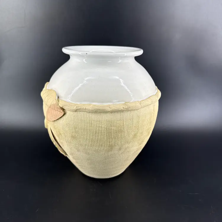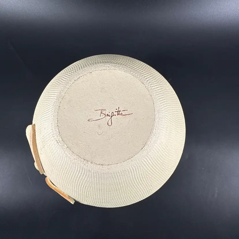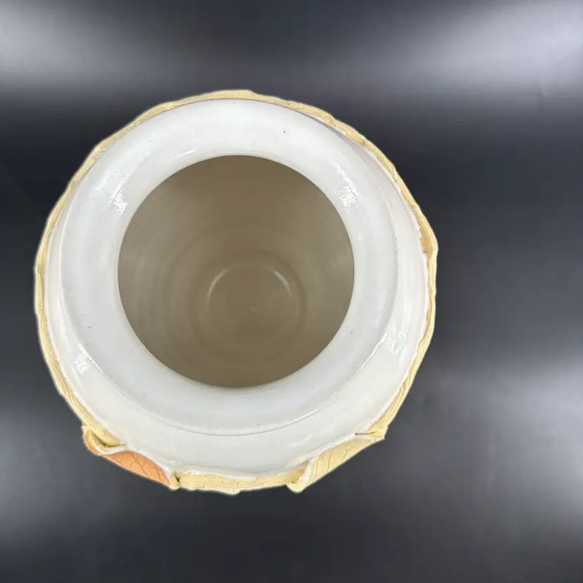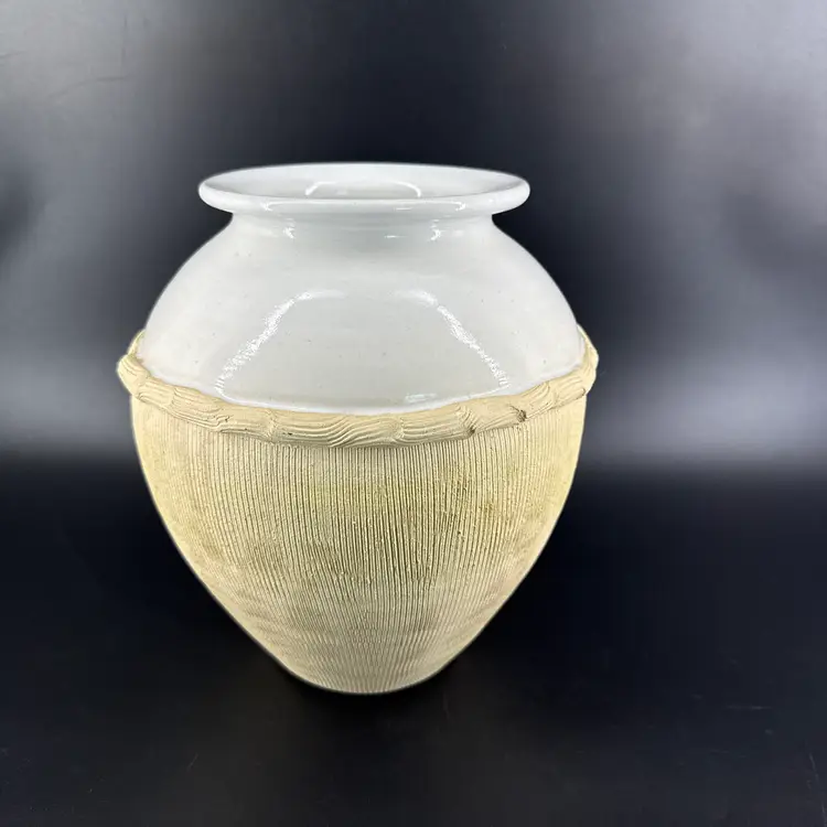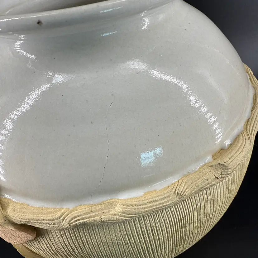 It is 8.5" tall and measures 8.5" in diameter at its widest. It is in good condition. There are no chips, breaks or repairs. There is a hairline crack on one side. (See photos).