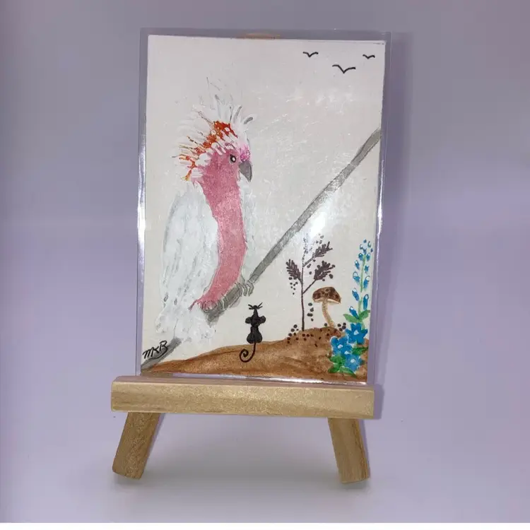 Pink Cockatoo and Mouse Hand Painted Miniature Artwork! Signed by the Artist! 2 1/2" wide by just over 3" tall! Includes a mini art easel for display! NEW to District? Enter code Michel42 into your wallet prior to your first ever purchase and save $5 off of any $10 or more purchase! Give me a Follow and I'll Follow you back! :) Happy Shopping!