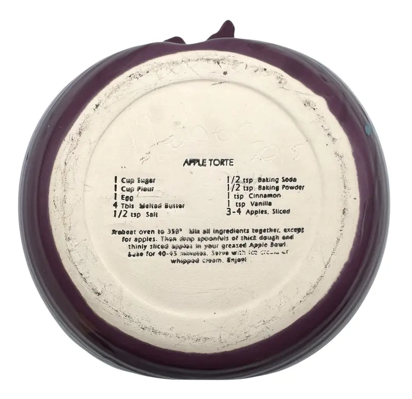 Pottery baking dish with a recipe for apple torte printed on the back.