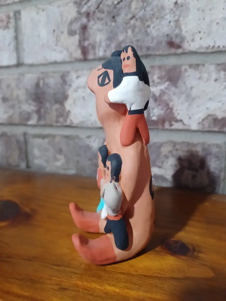 This 5-inch clay figure features a traditional storyteller surrounded by individually hand-formed children figures, each uniquely shaped and painted. The piece has a natural matte clay surface with hand-painted details and a large geometric symbolic design on the back, giving it strong visual presence from all angles.