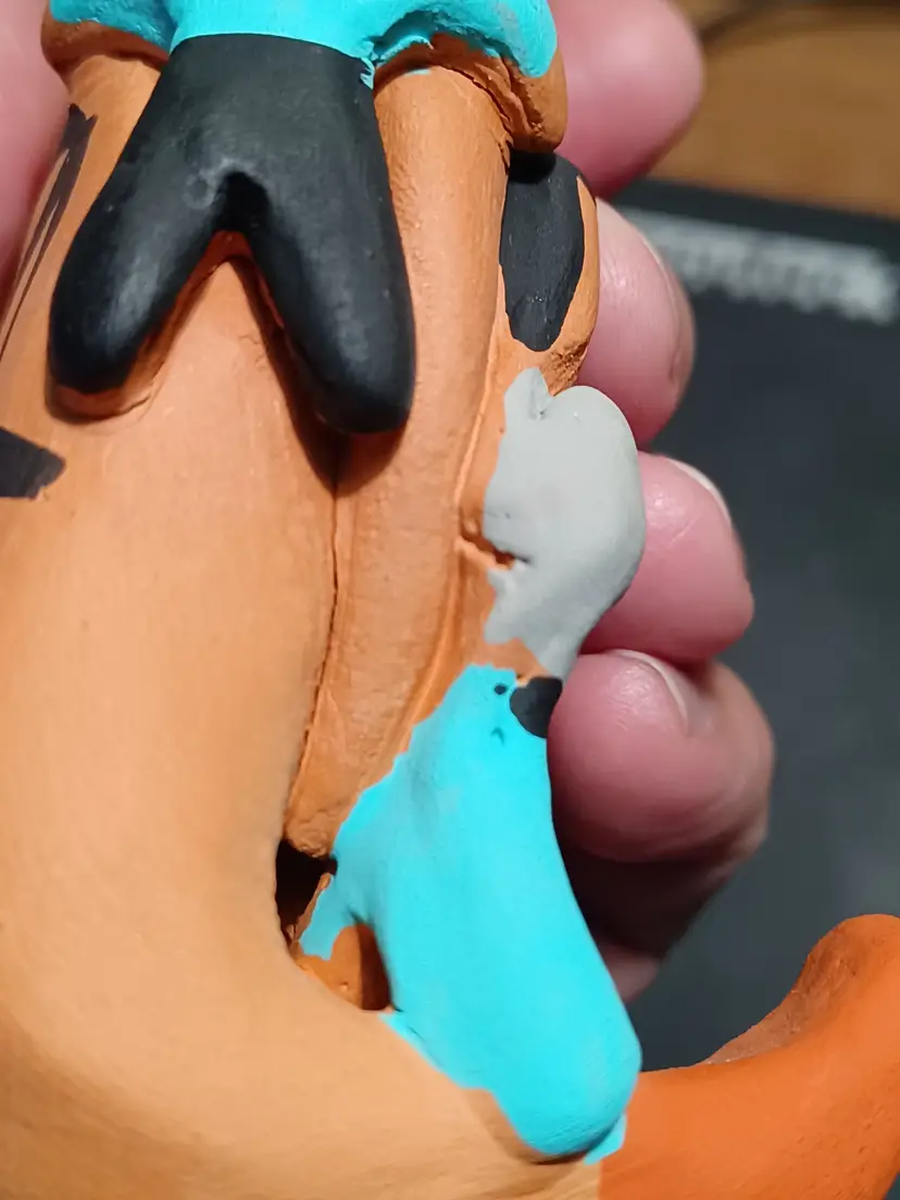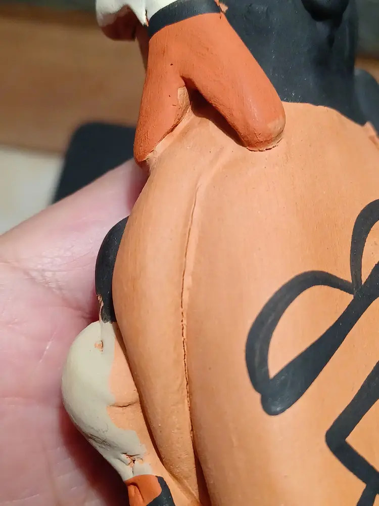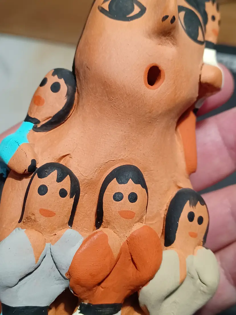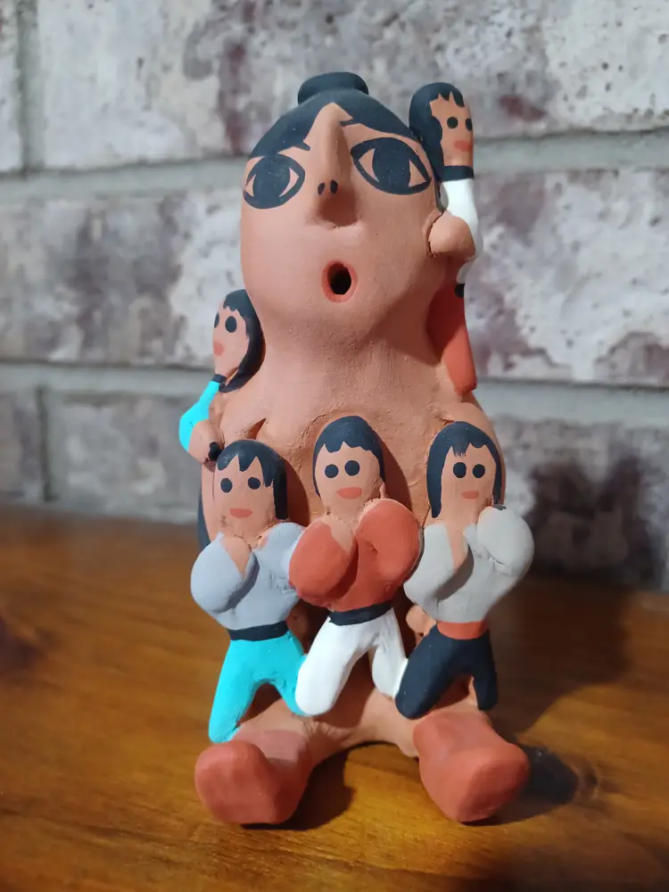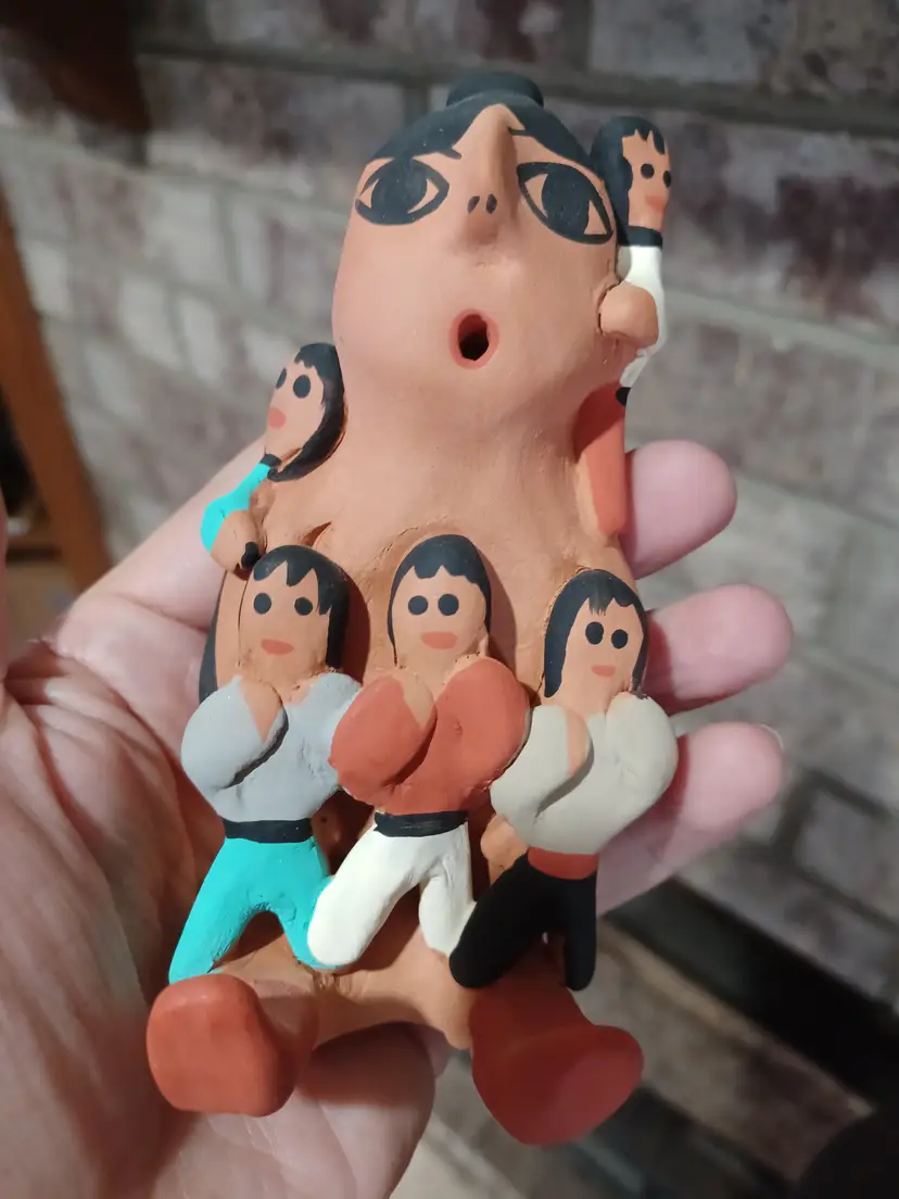 Air passes through the figure from base to mouth, a construction method often seen in handcrafted pottery forms. The surface shows the texture and character expected of handmade clay work.