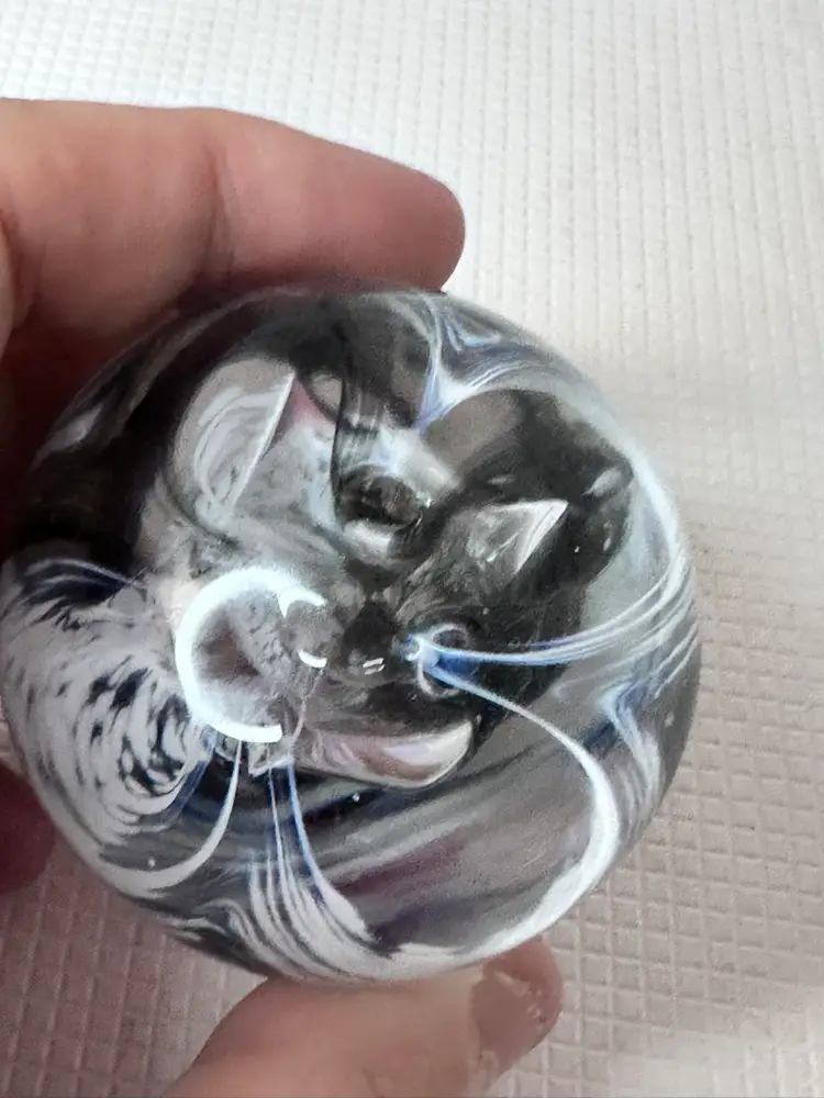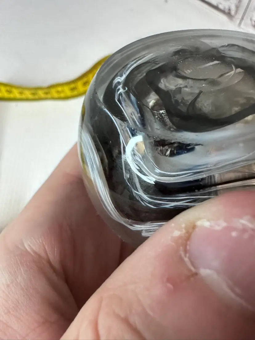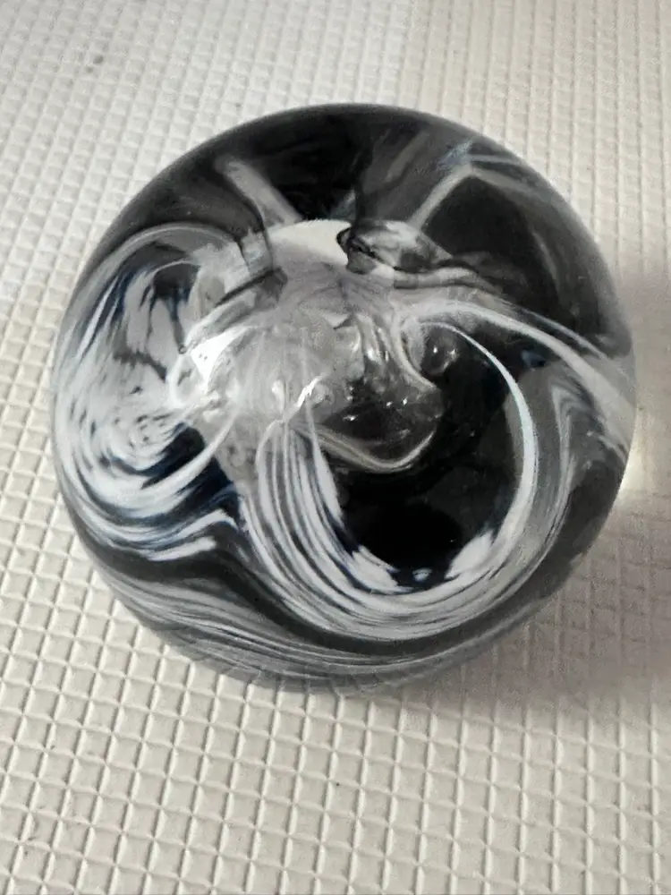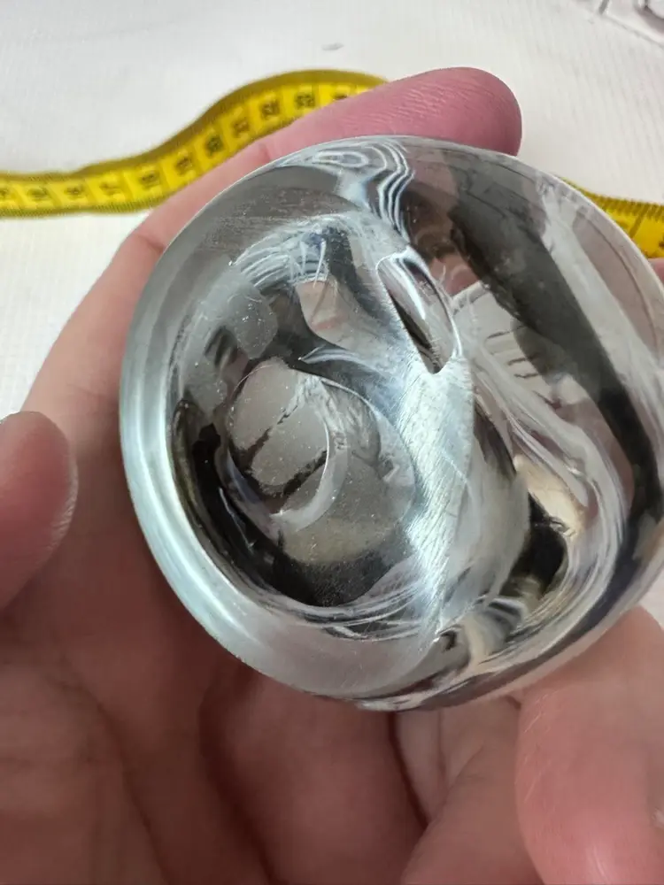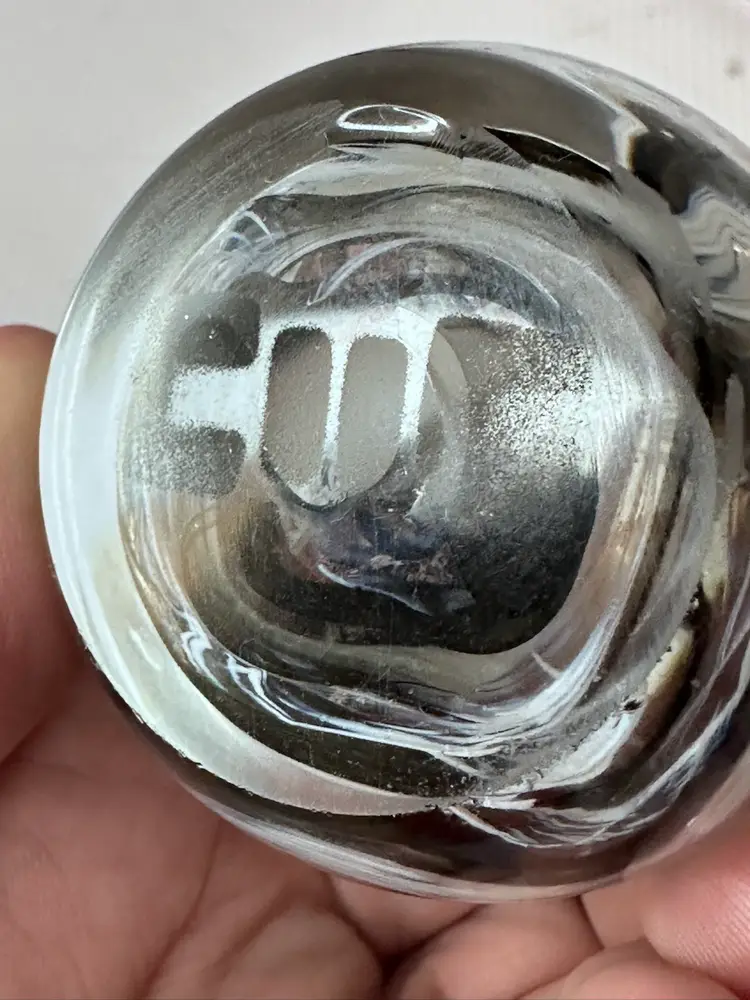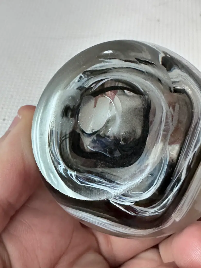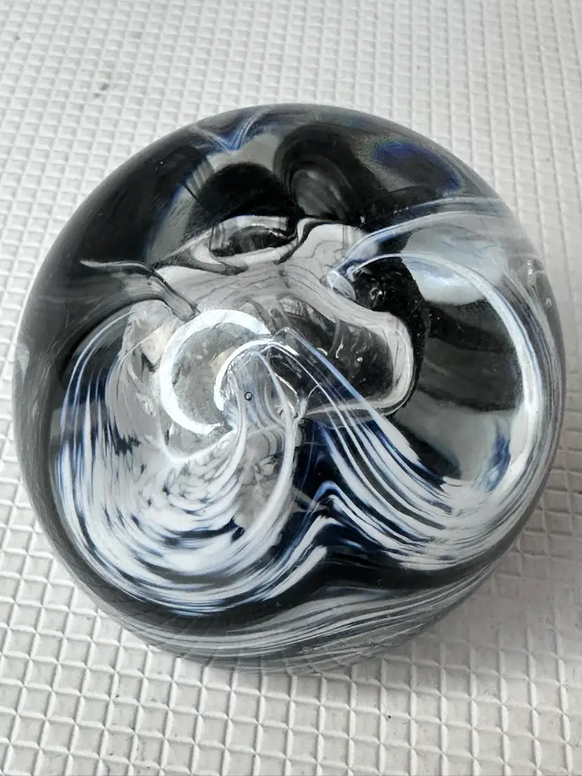 Measures 2.3”tall a chipped at the button of the paperweight and flea-bites on the side at the button of the base minor