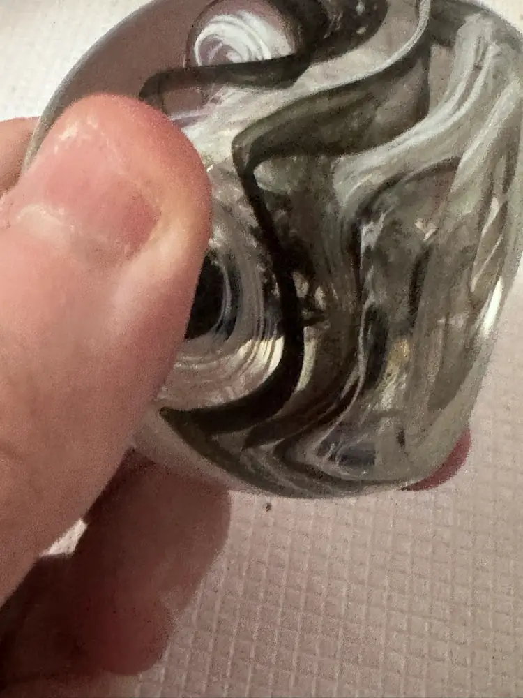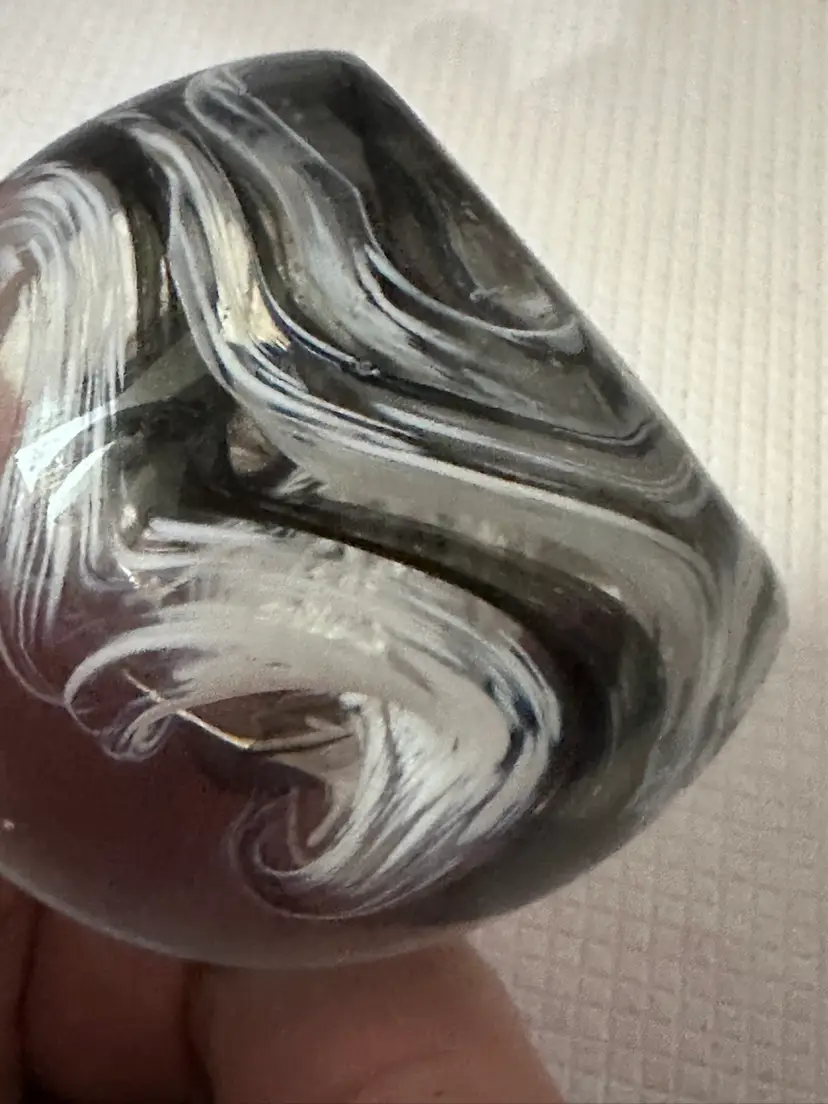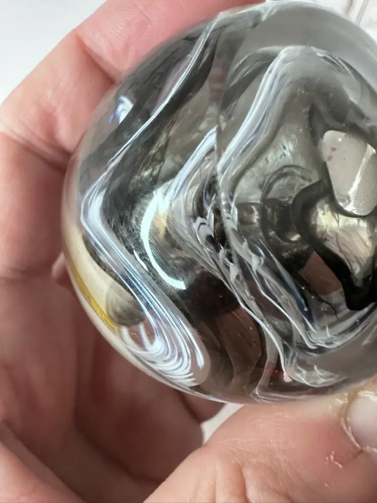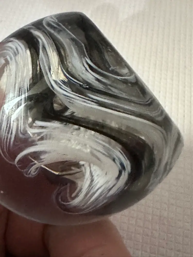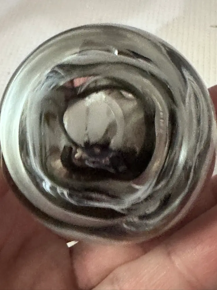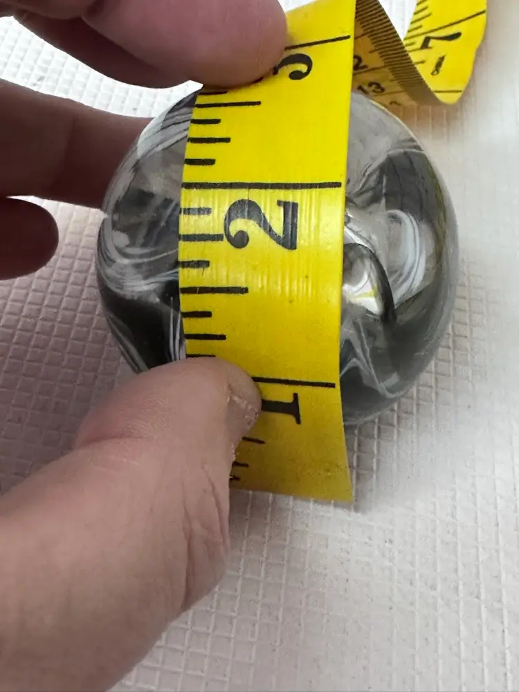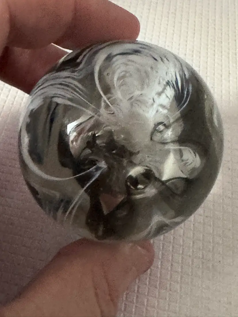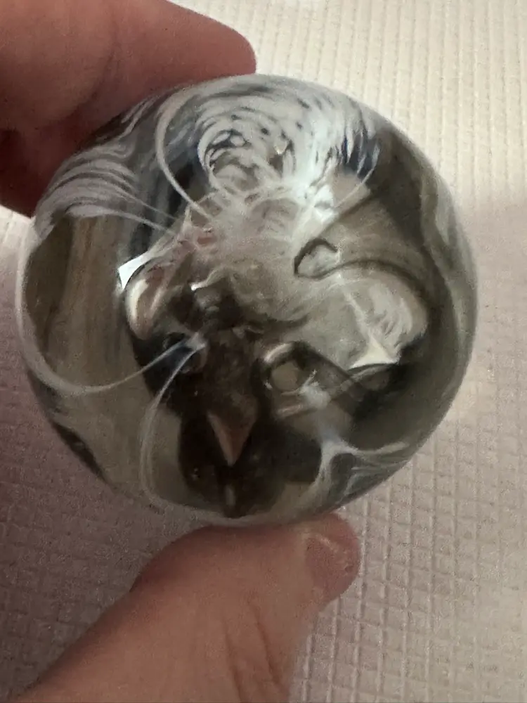 Measures 2.3”tall a chipped at the button of the paperweight and flea-bites on the side at the button of the base minor