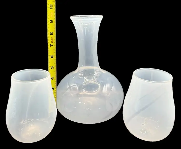 Condition: No chips or cracks. Dimensions: Decanter 9.5” tall. Glasses 4.5” tall