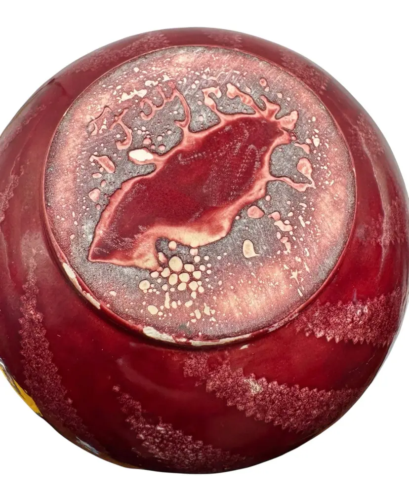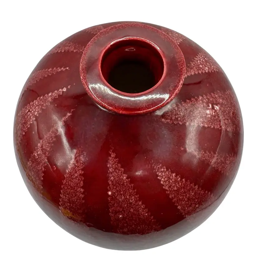 Red pottery vase with a jagged leaf-like design. It is signed ‘Fay’.