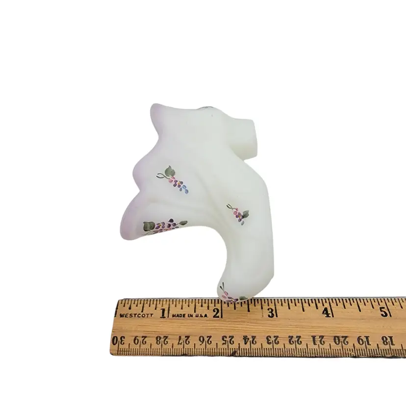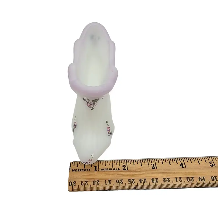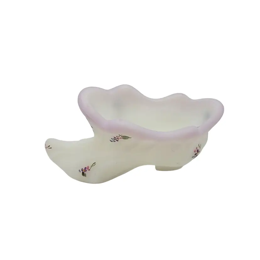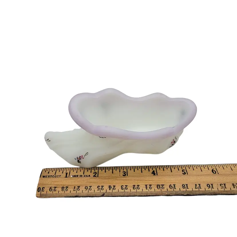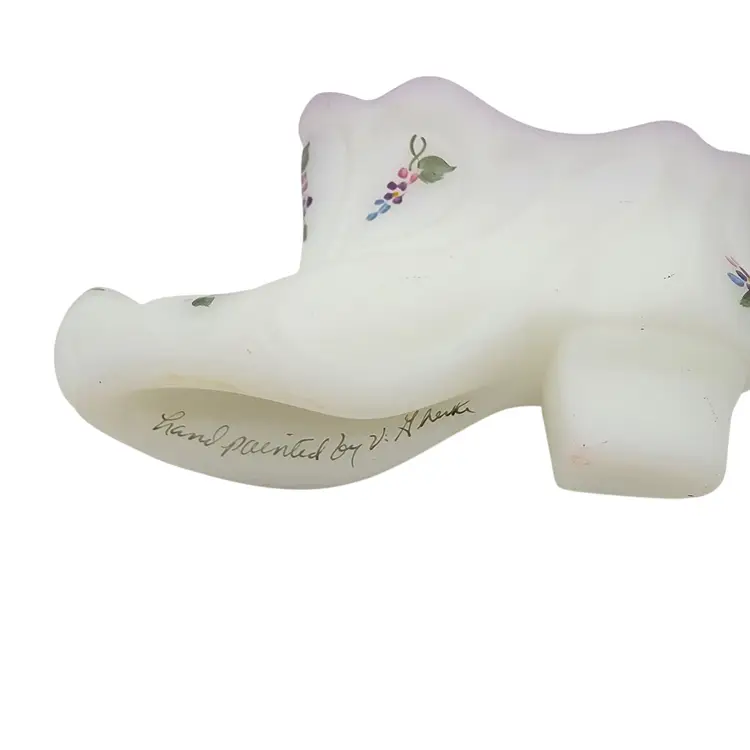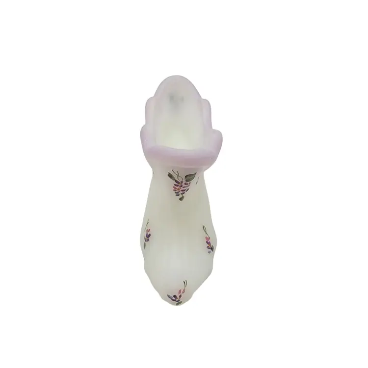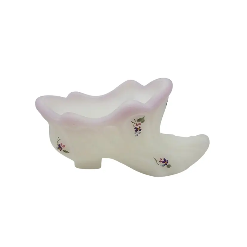 This is a beautiful white satin Fenton shoe/boot with pale purple accents and hand painted lilacs.