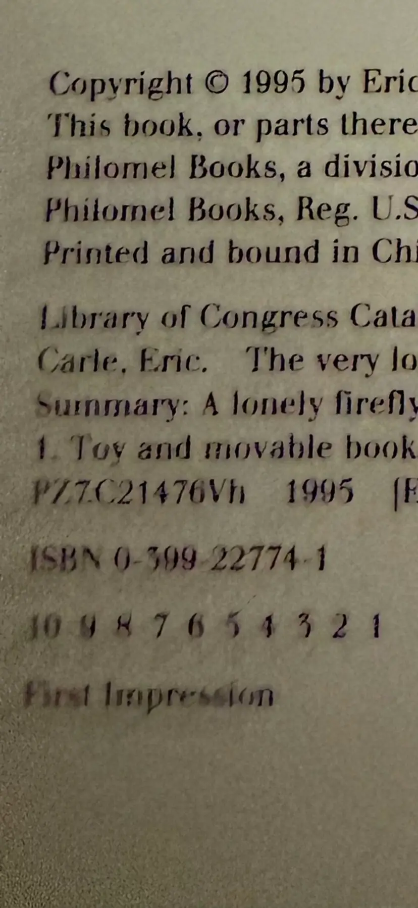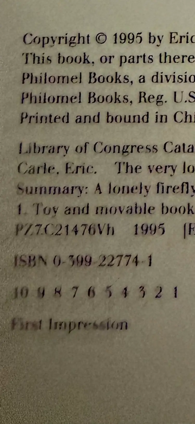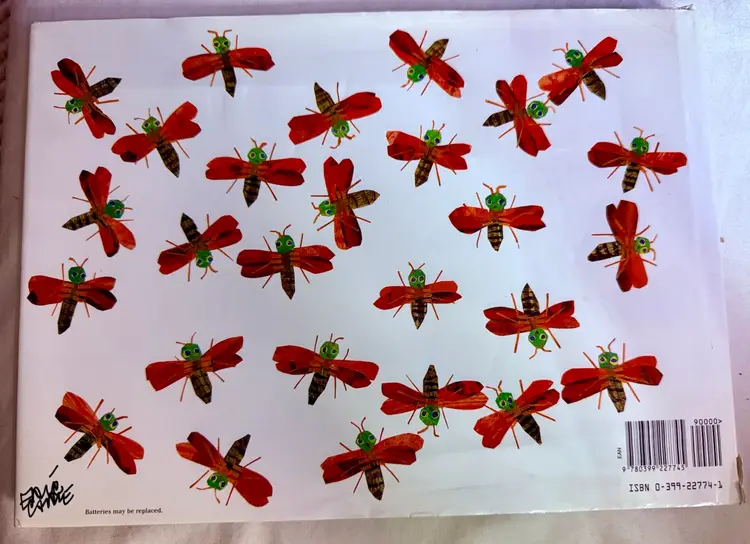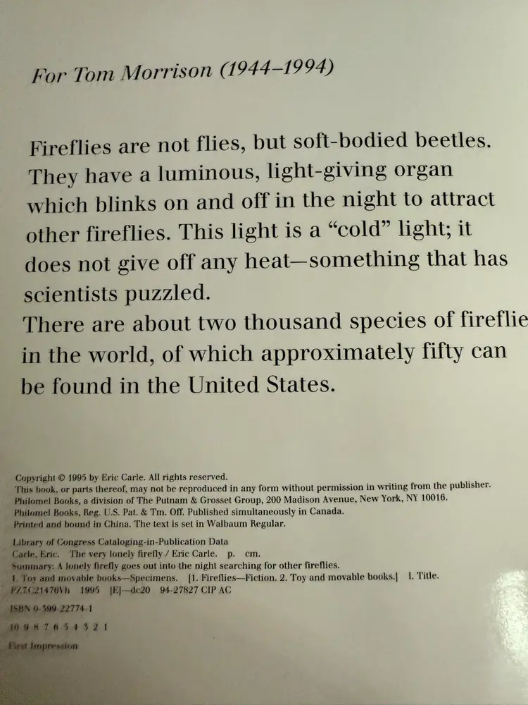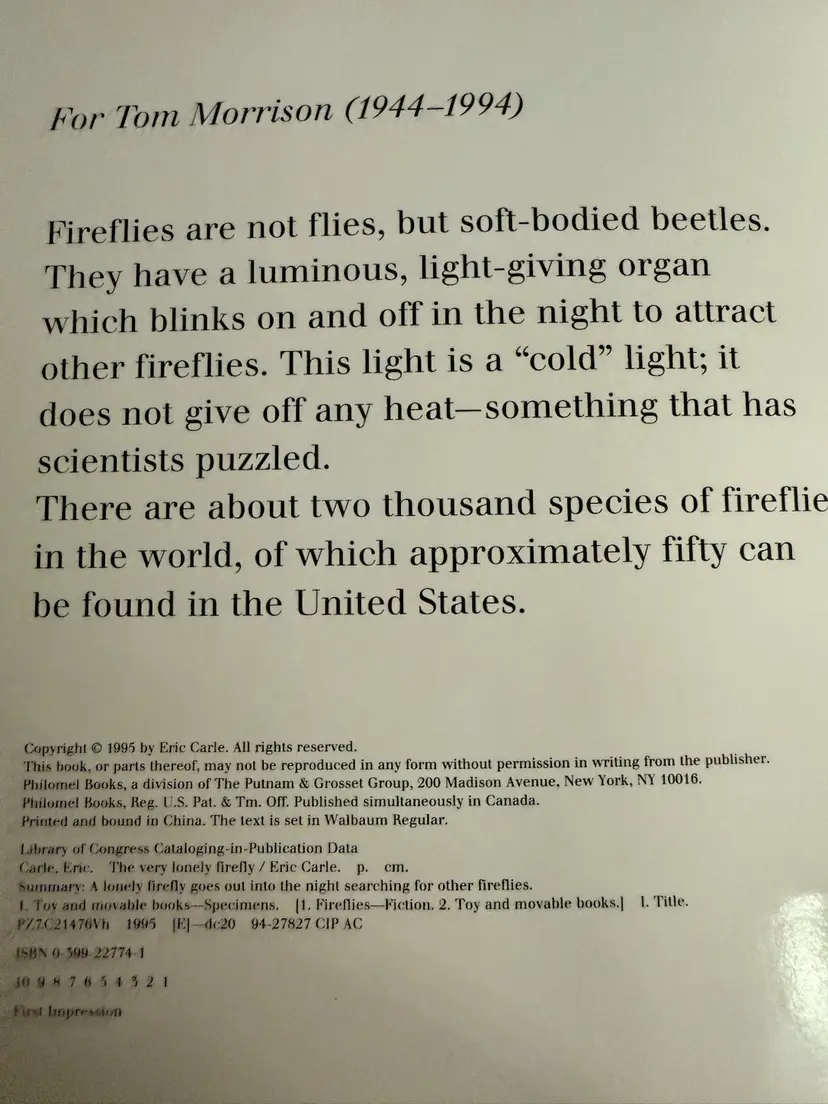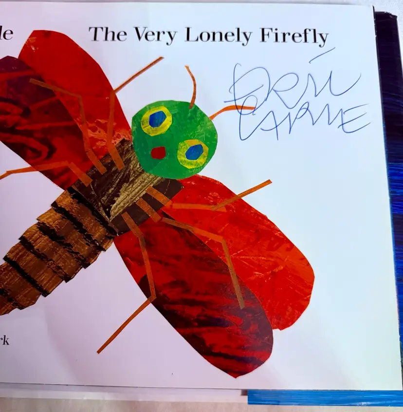 Very rare copy of the first impression hardcover copy of the Very Lonely Firefly. Slight damage on the bottom of spine/ dust cover. Potential to light up by replacing the battery on the back. Current similar listing on EBay for $1248 through Rare Book Sellers. Eric Carle signed this copy when I met him in downtown Rochester, Michigan at the children’s book store called halfway down the stairs. Copyright 1995