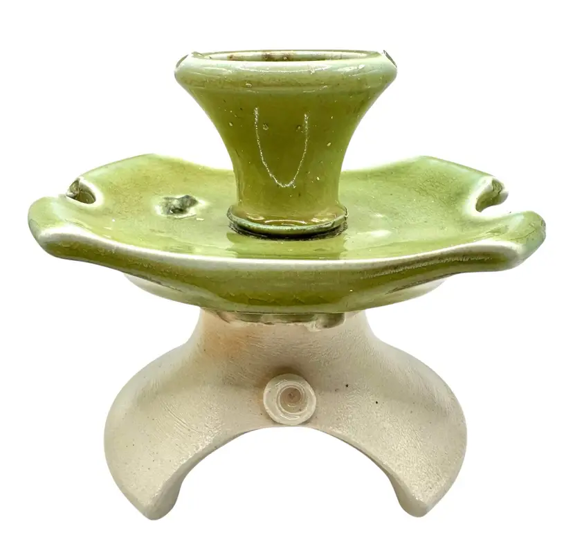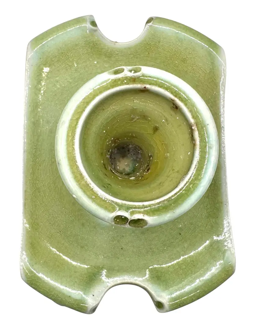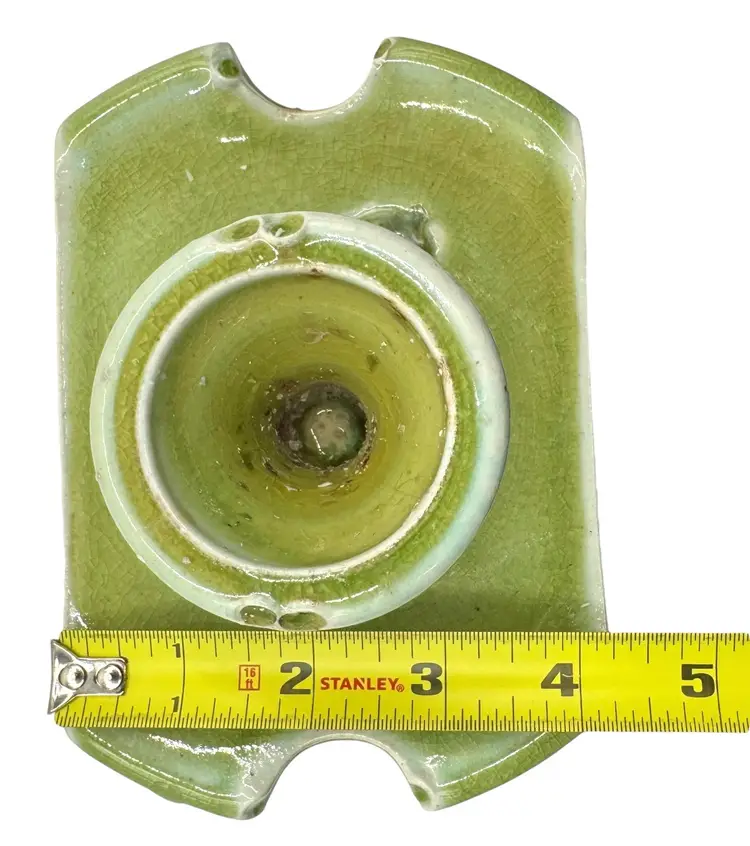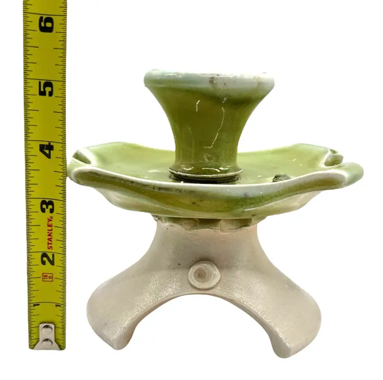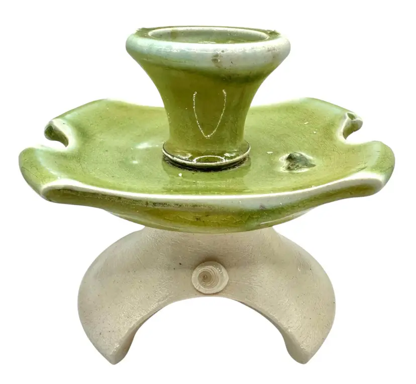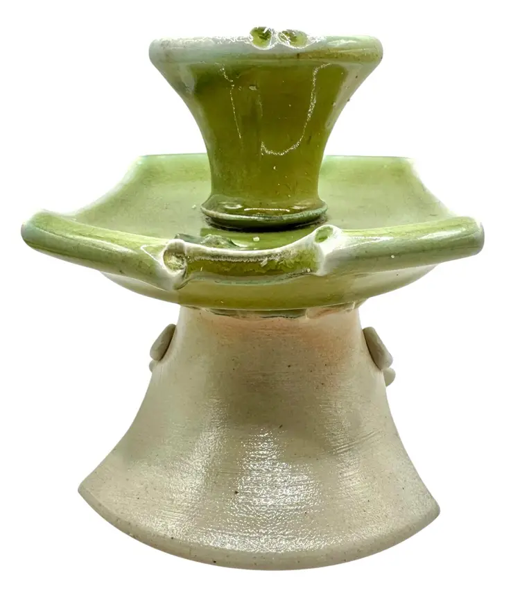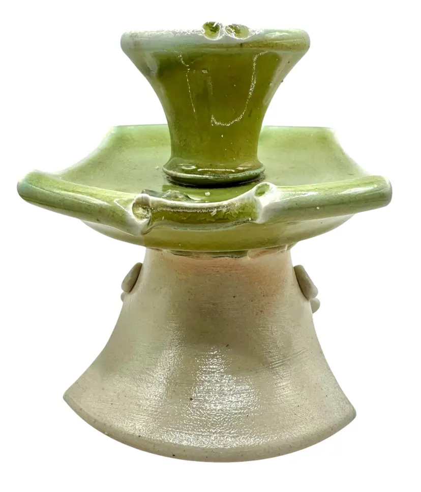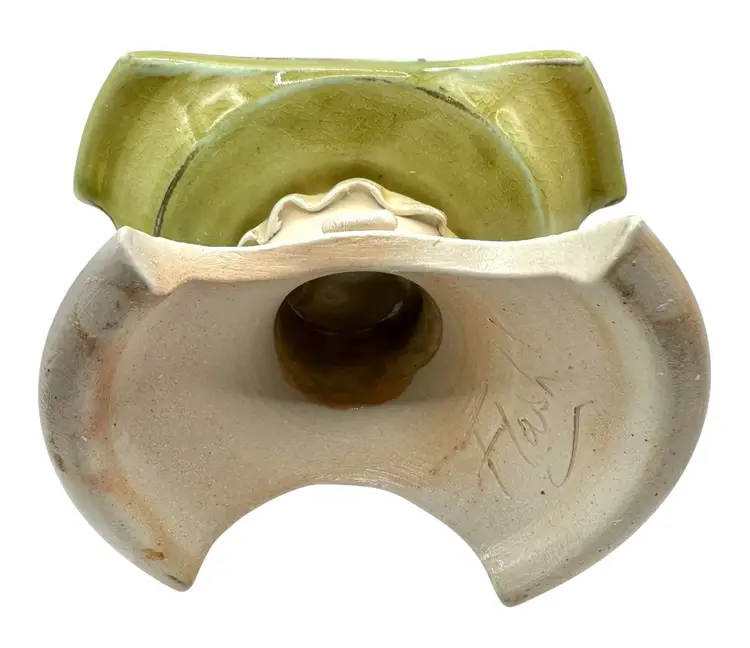 Unique candle holder signed by ‘Flash!’. It is shaped in the style of a pagoda, with a lovely crazed green glazed.