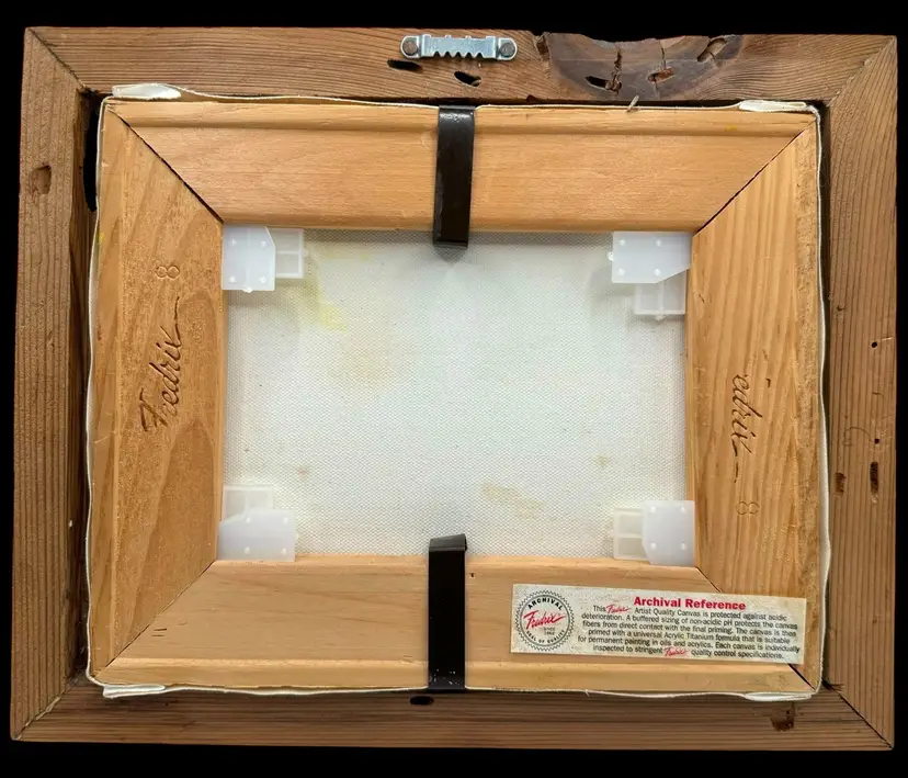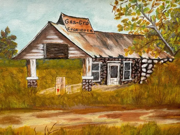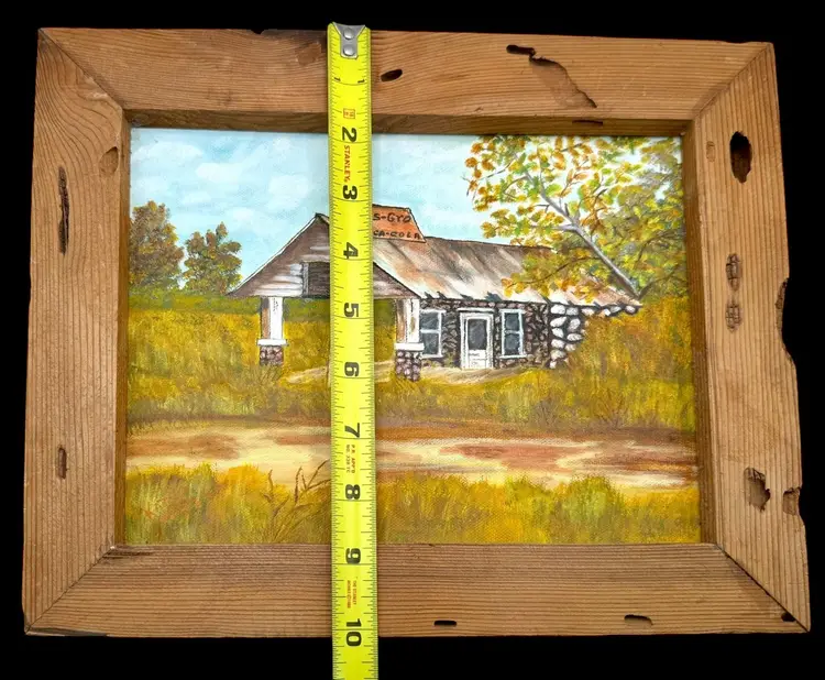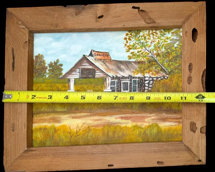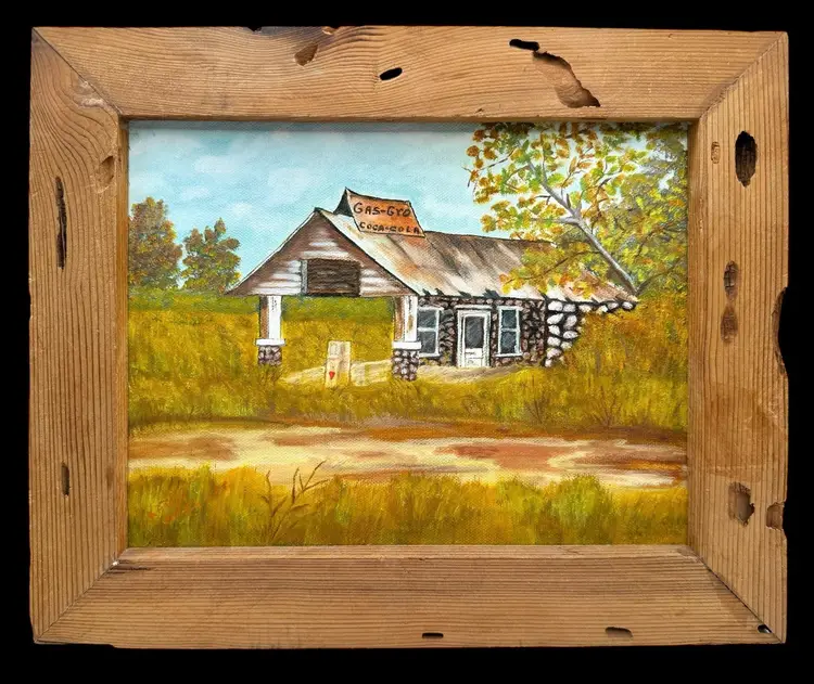 Framed painting of a seemingly abandoned roadside gas station/convenience store. The frame is made to look rustic.