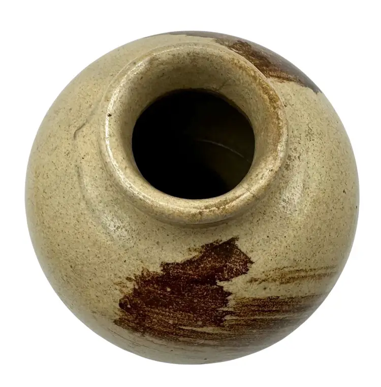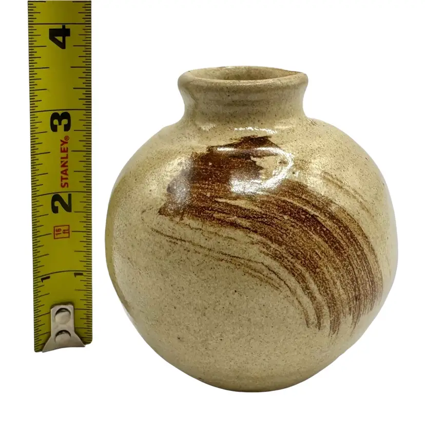 Small pottery bud vase with abstract brush stroke design.