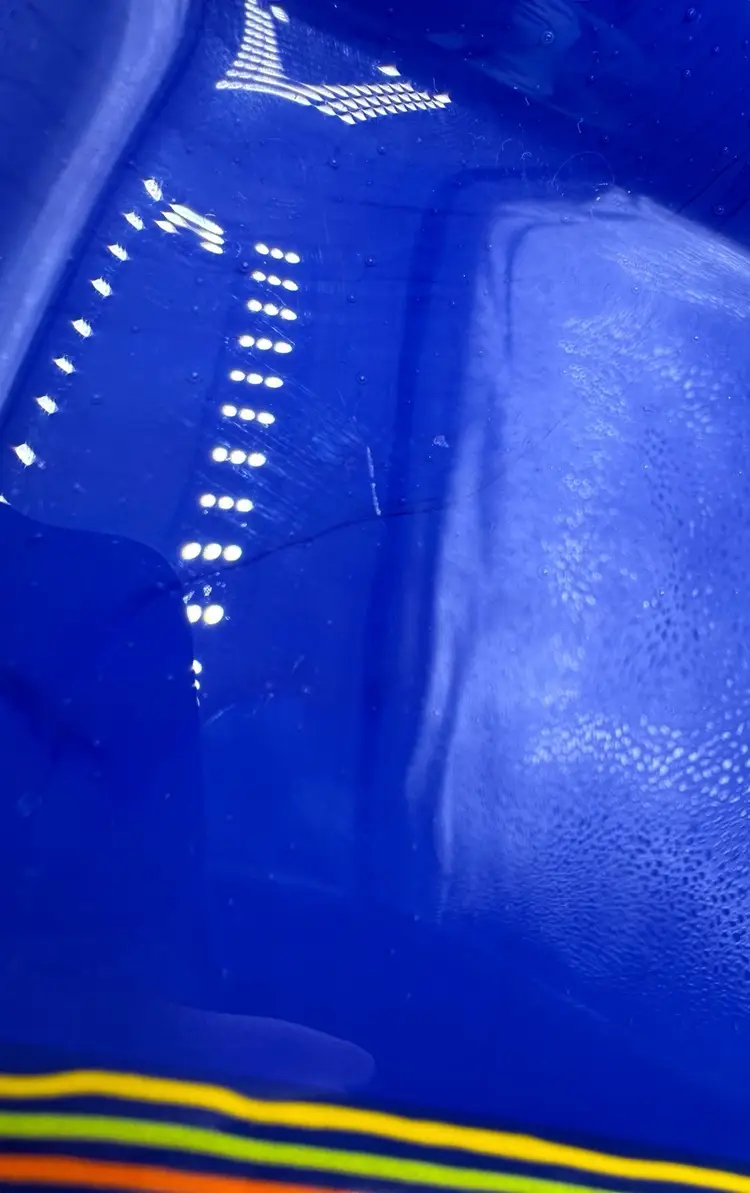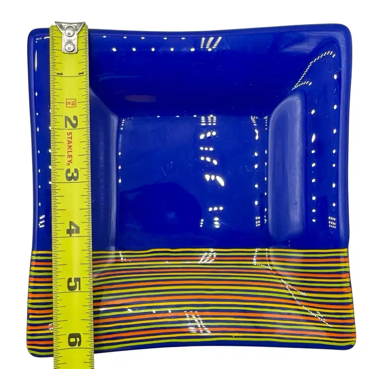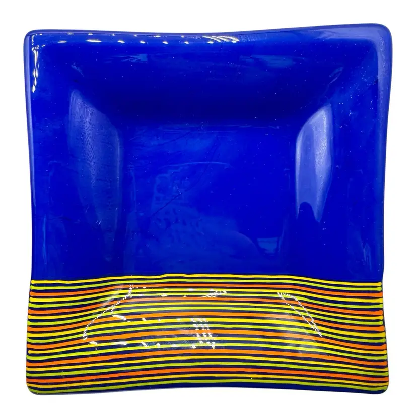 Fused glass plate signed and marked ‘04. It has a bright blue base with small yellow, orange and green strips at the bottom.