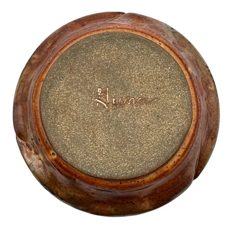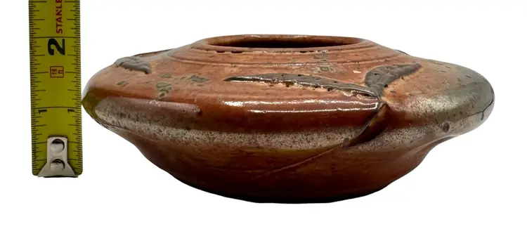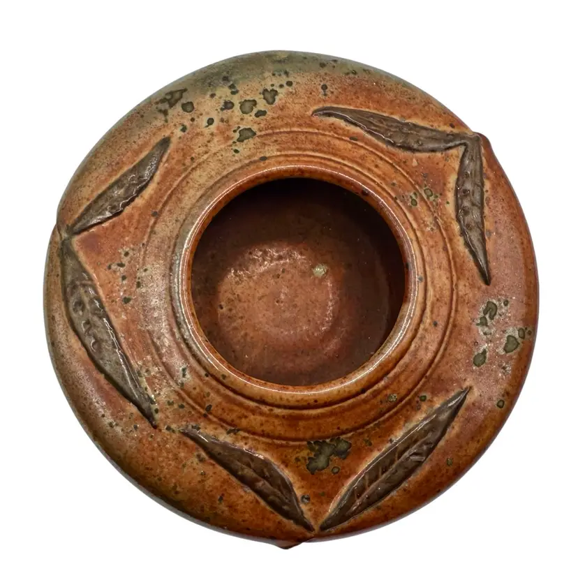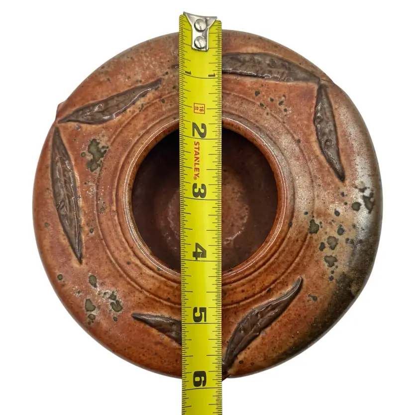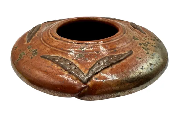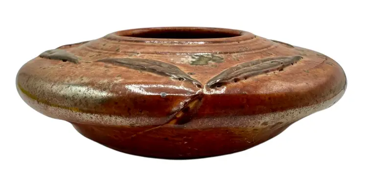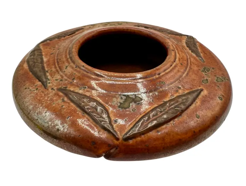 Beautiful pottery vase with a low disc shape. It has a slightly shiny metallic glaze over a burnt orange terracotta color. There are 3 sets of leave around the edges.