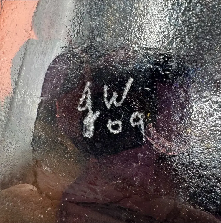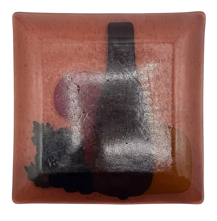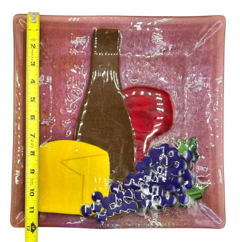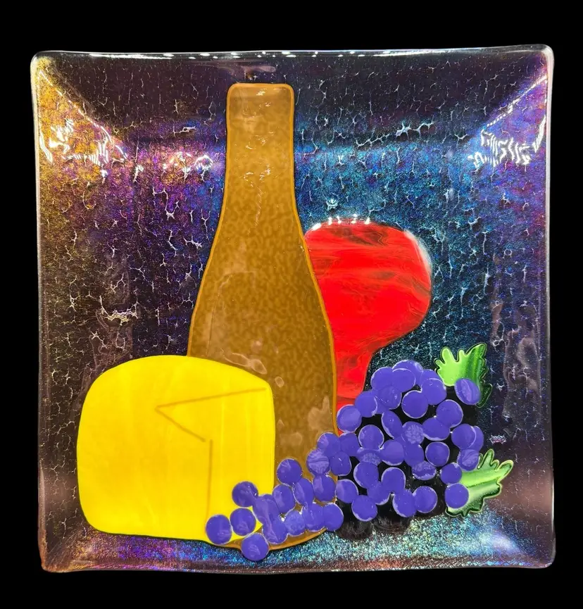 Large fused glass plate with wine, cheese, and grapes over an iridescent, amethyst purple background. It is marked ‘GW 06’